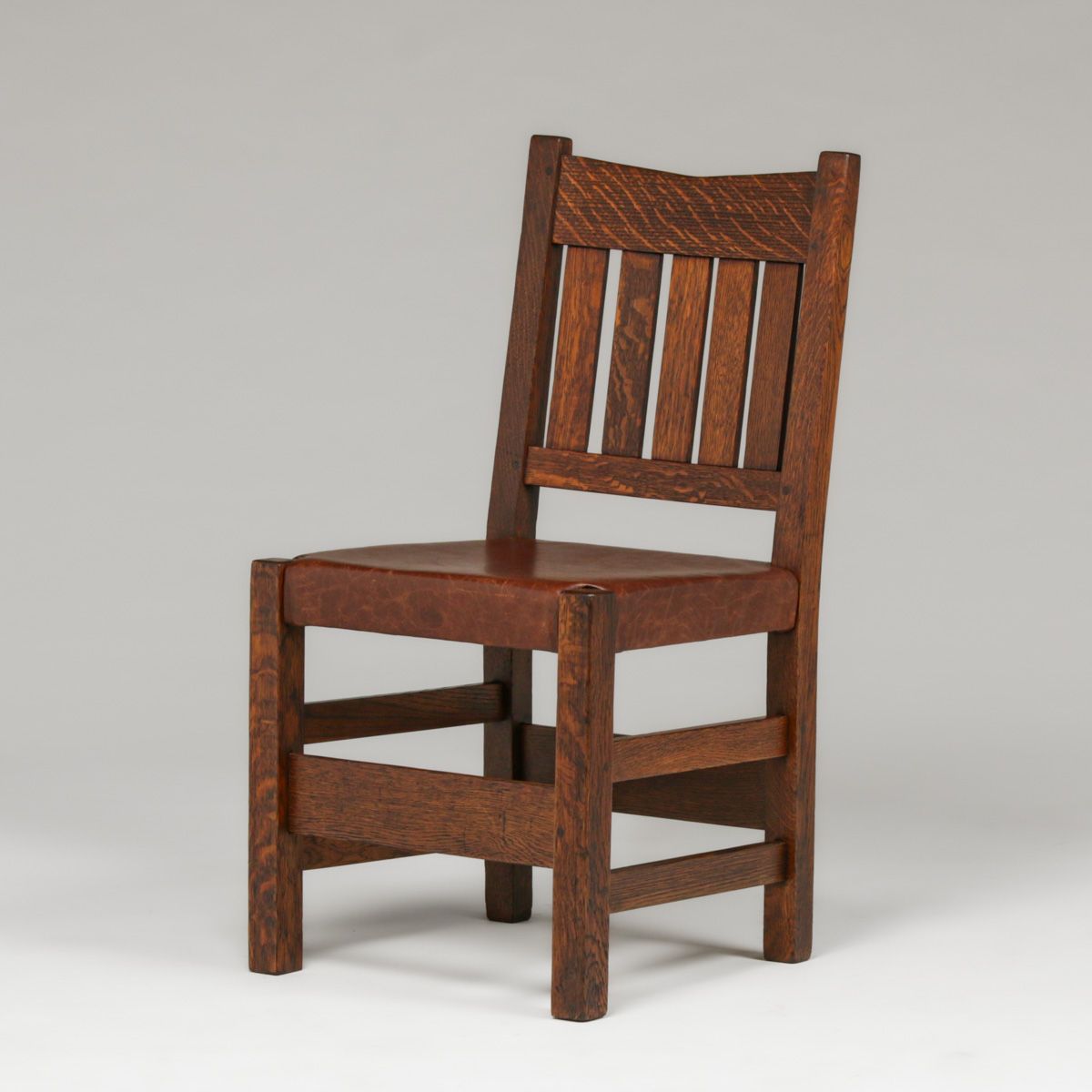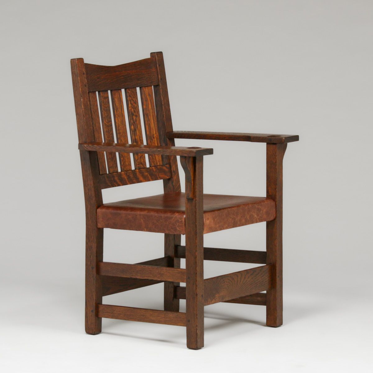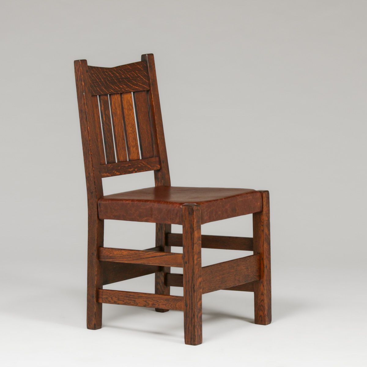 Gustav Stickley Set of 6 V-Back Dining Chairs c1910. One armchair and five side chairs. Signed. Excellent original finish. Rock solid sturdy. Arm Chair: 37”h x 25.75”w x 21”d Side Chairs: 35.25”h x 19”w x 19.5”d