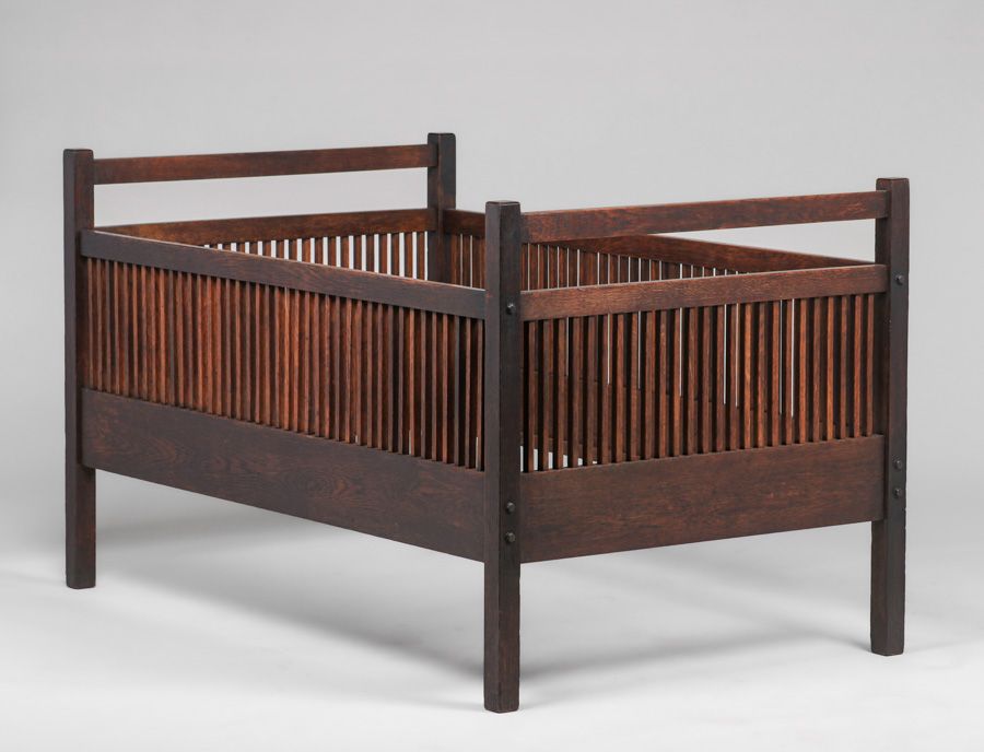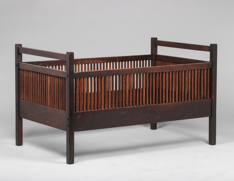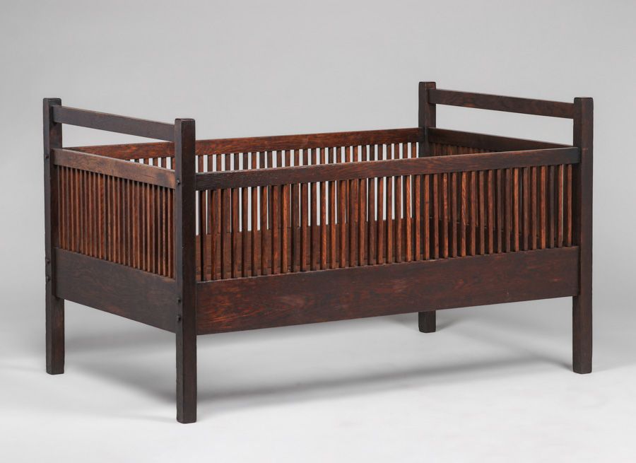 Gustav Stickley Spindled Crib c1907. Signed with remnant of paper label. Excellent original finish. 33.75"h x 56.75" x 35.5" SOLD