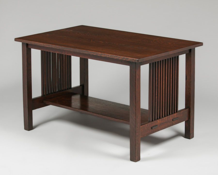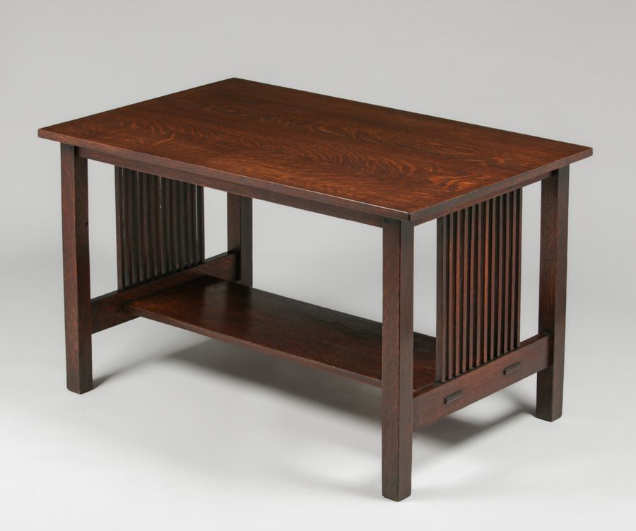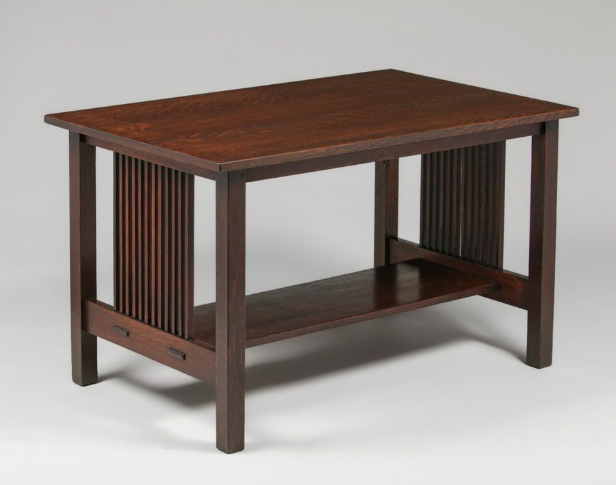 Gustav Stickley Spindled Library Table c1907. Unsigned. Top refinished perfectly to match excellent original finish. 48" x 30"d x 29"h SOLD