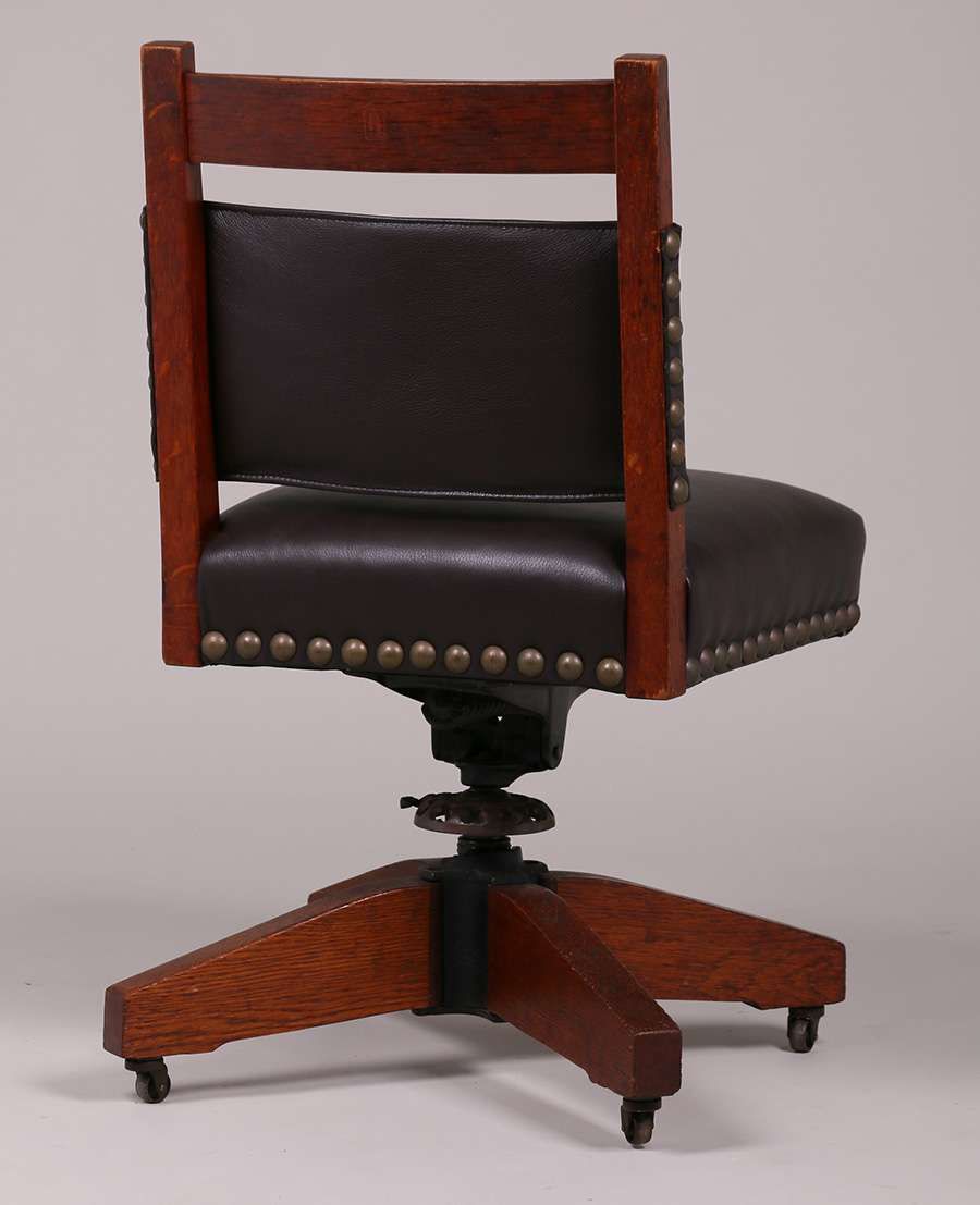 Gustav Stickley swivel chair c1902-1904. Signed with early red decal in box at the top back of the backrest. Excellent original finish. 33.5″h x 19"w x 18"d SOLD