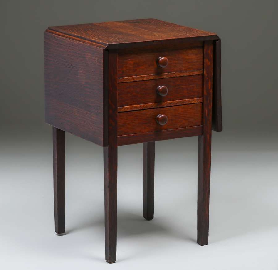 Gustav Stickley Three-Drawer Drop-Leaf Table c1910. Signed. Original finish. 28″h x 17″w x 16″d (42″w with leaves up)