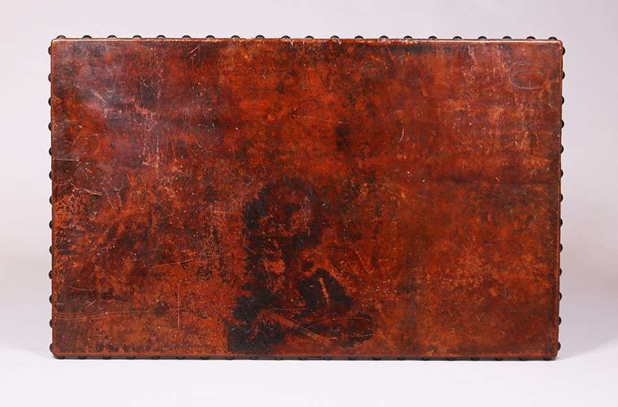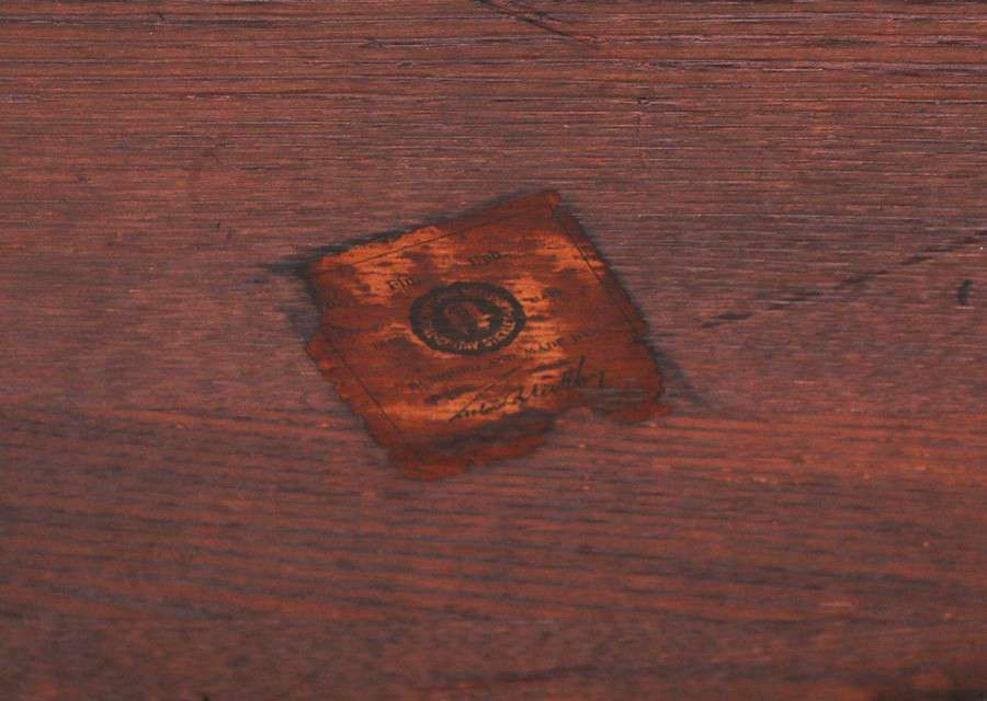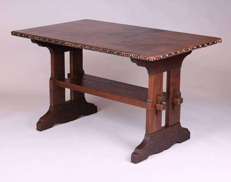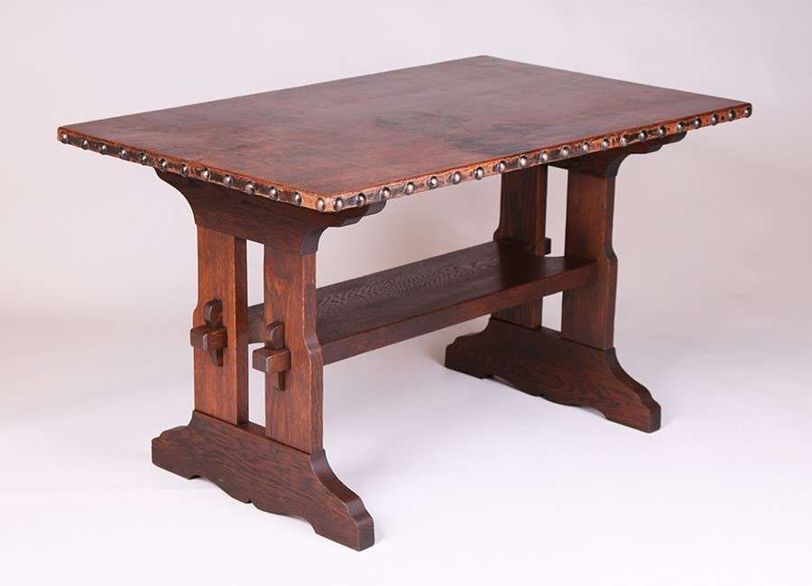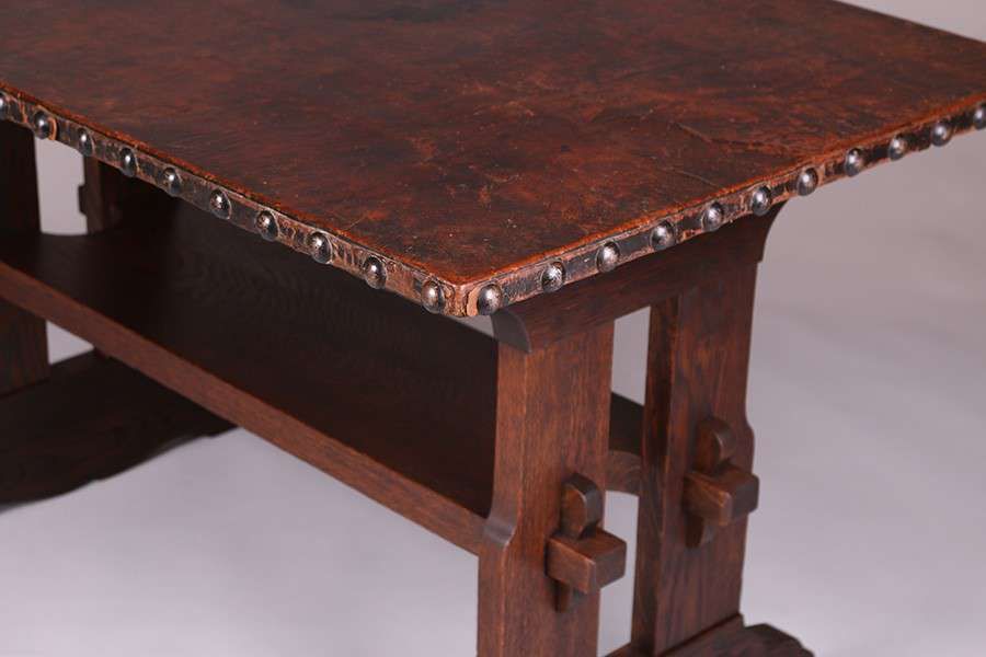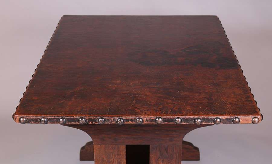 Gustav Stickley Trestle Table with Original Leather Top. Signed. Excellent original finish. 48"w x 30"d x 28.5"h SOLD