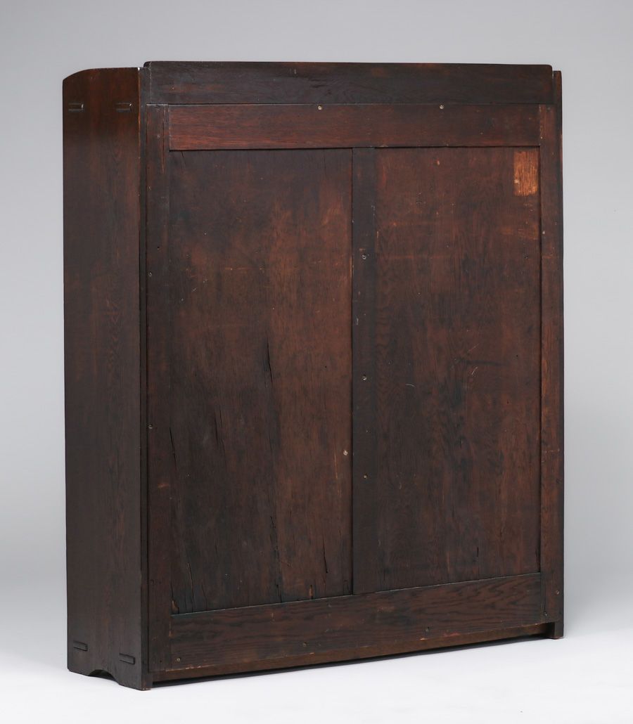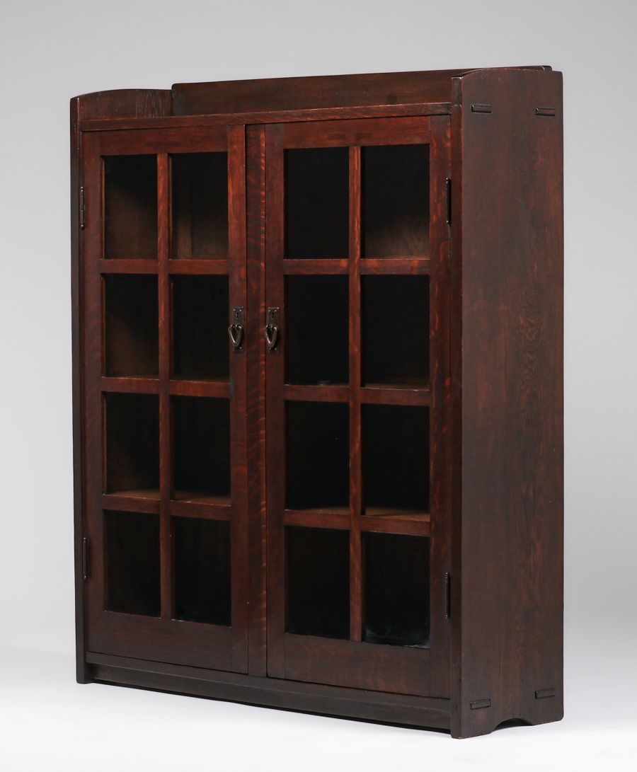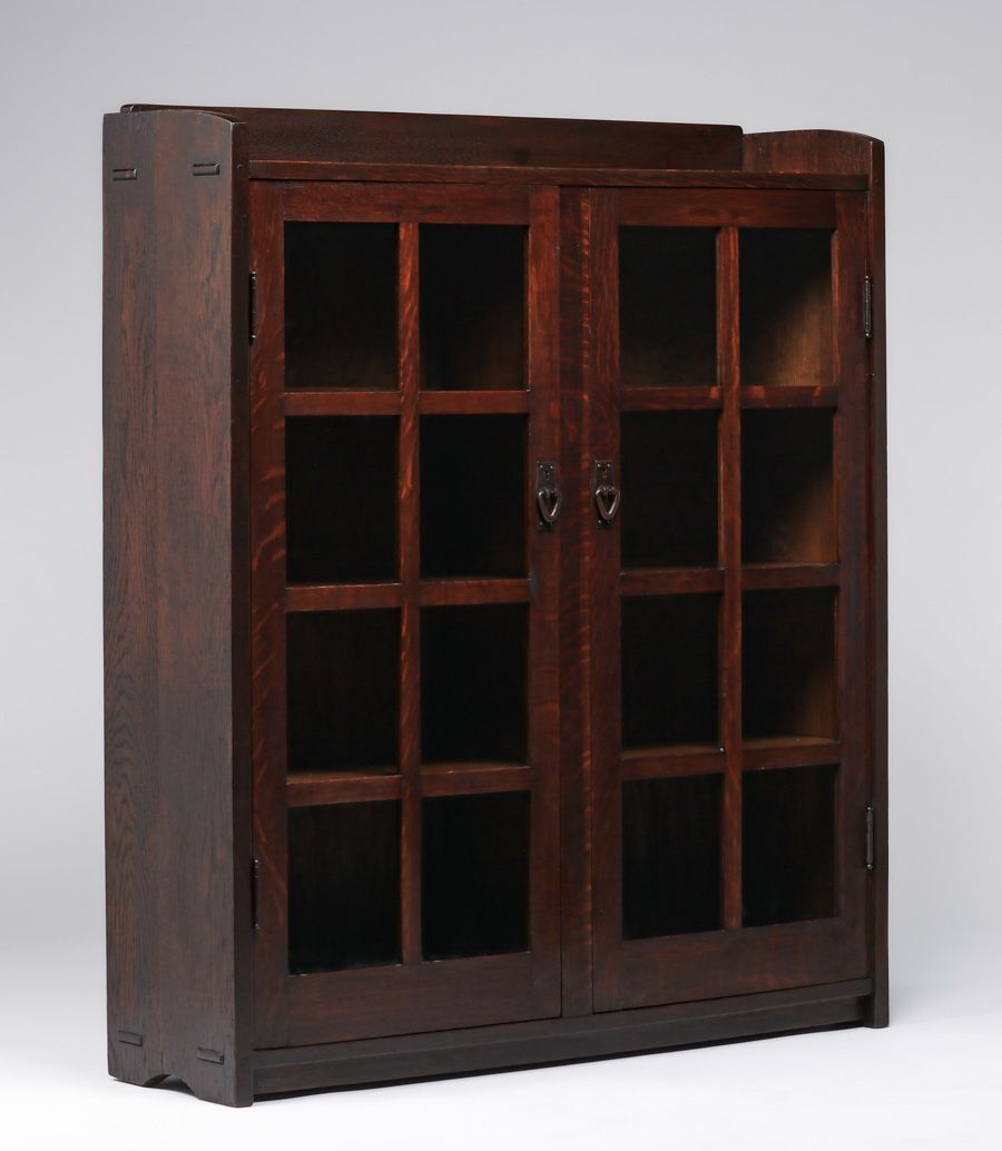 Gustav Stickley Two-Door Bookcase c1910. Signed with red decal inside door and remnant of paper label. Excellent original finish. 55.25"h x 48"w x 12 7/8"d SOLD