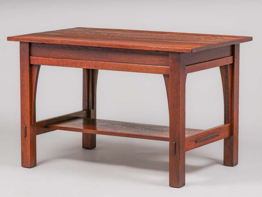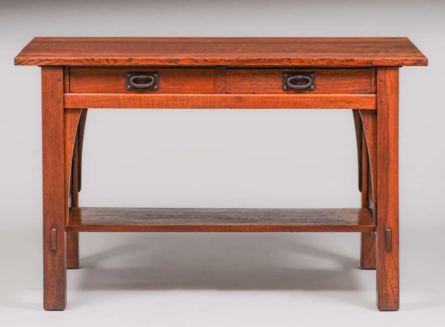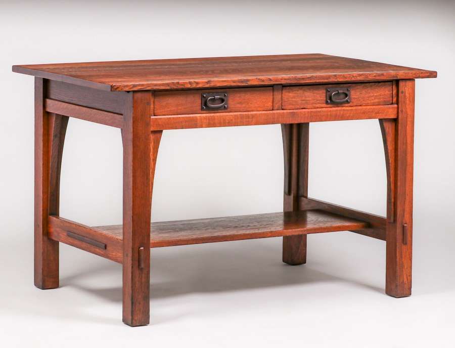 Gustav Stickley Two-Drawer Library Table c1910. Signed with paper label. Color added to original finish. 48"w x 28.75"d x 30"h SOLD