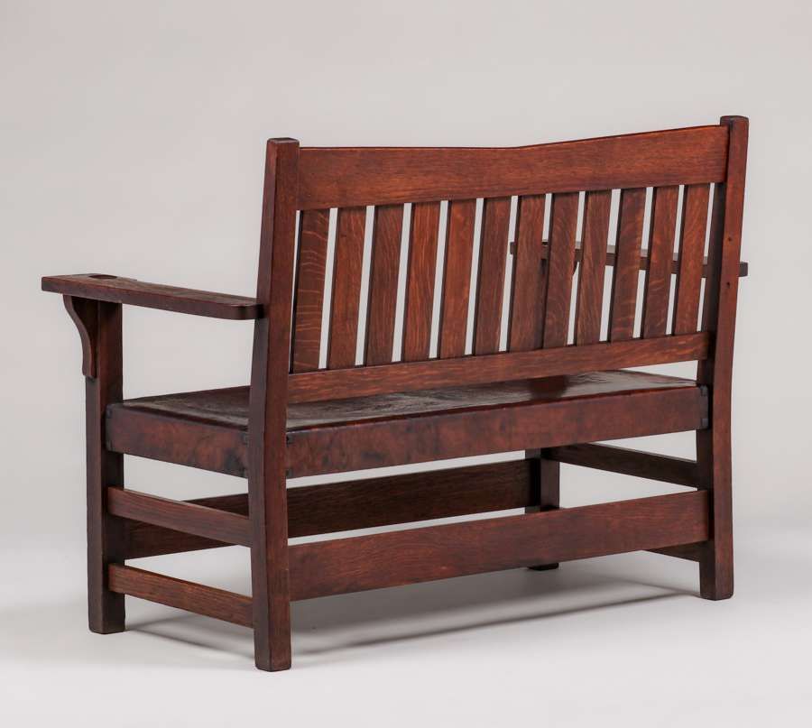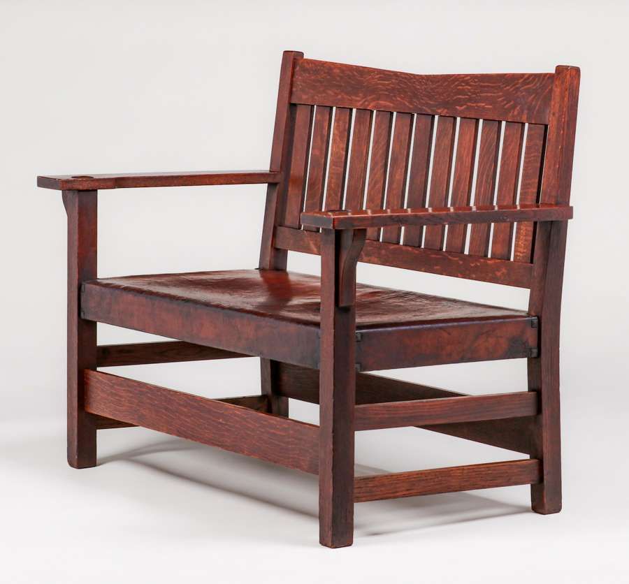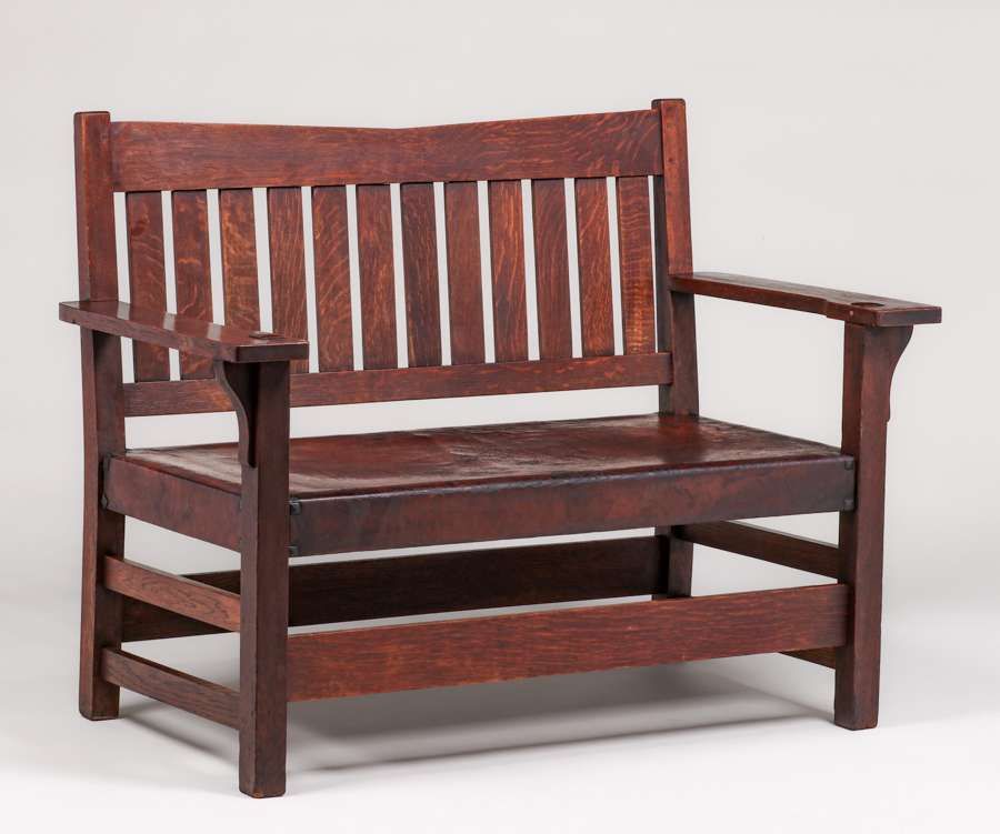 Gustav Stickley V-Back Bench c1910. Signed. Excellent original finish and original leather seat. 47.5″w x 36″h x 24″d SOLD