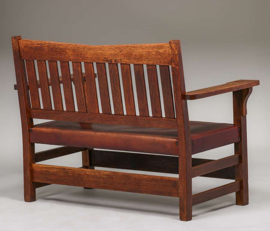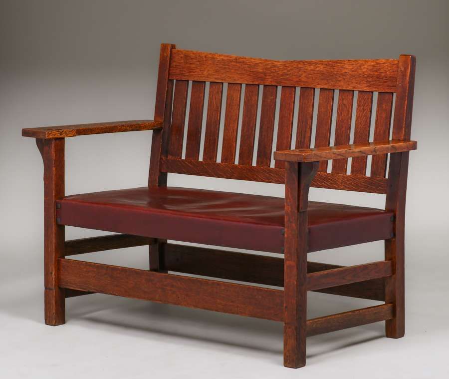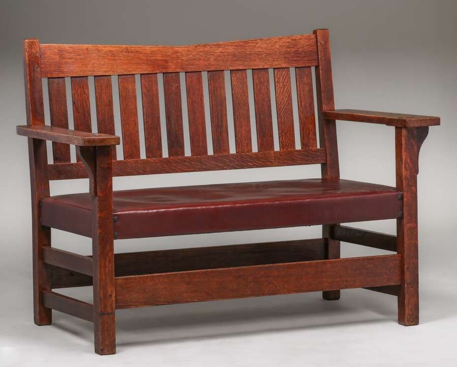 Gustav Stickley V-Back Bench c1910. Signed. Excellent original finish. 47"w x 35"h x 25"d SOLD