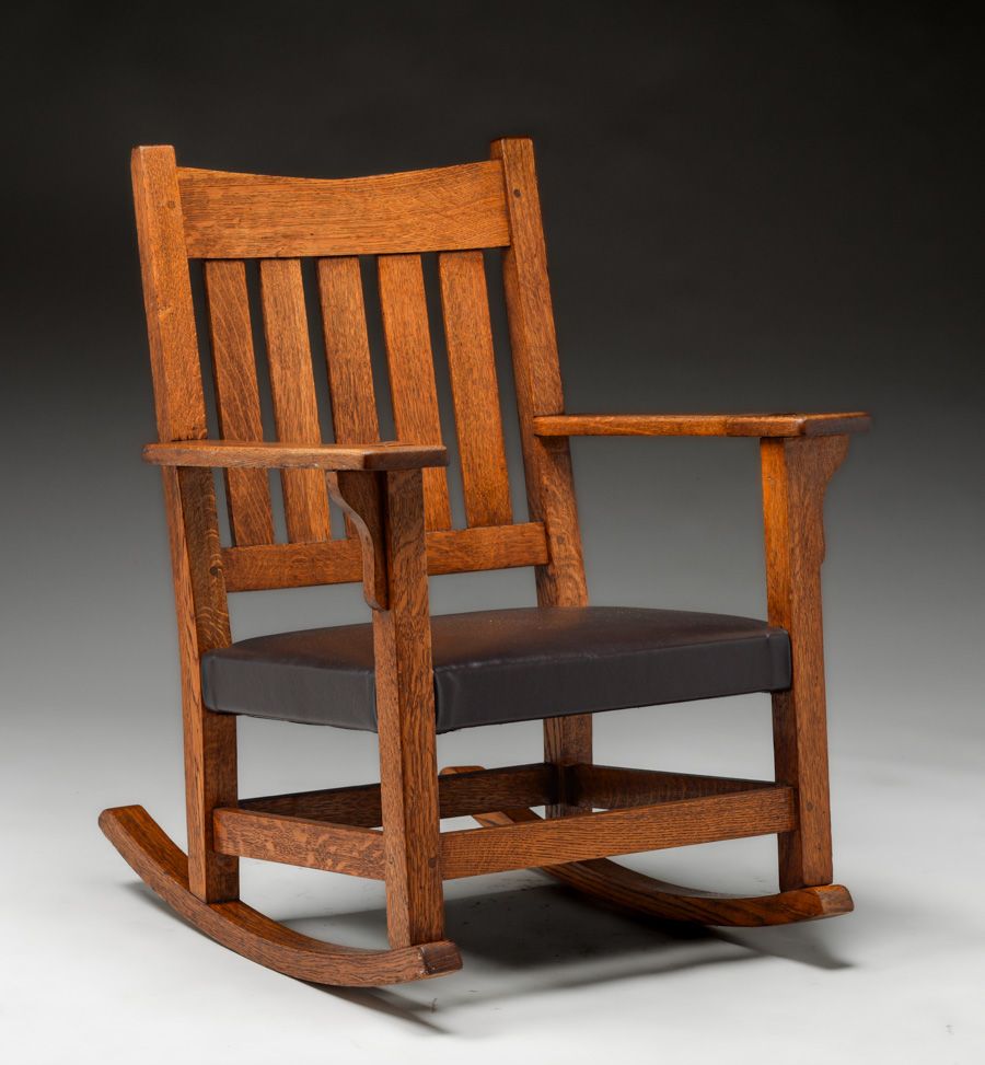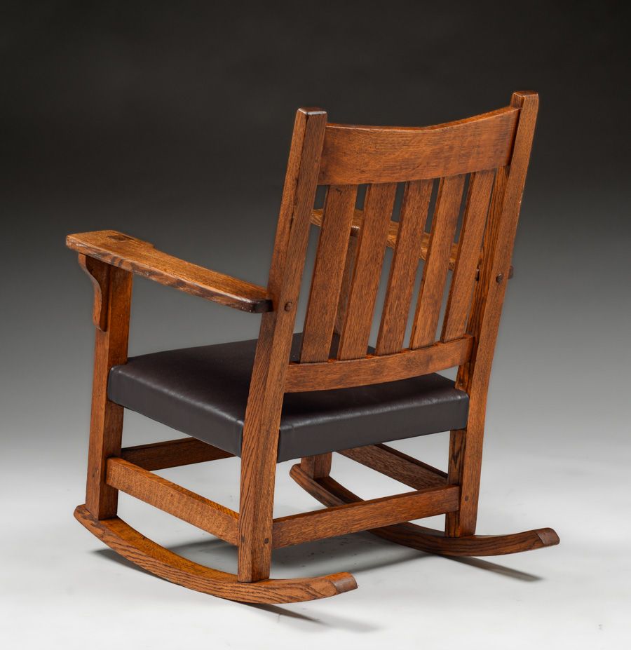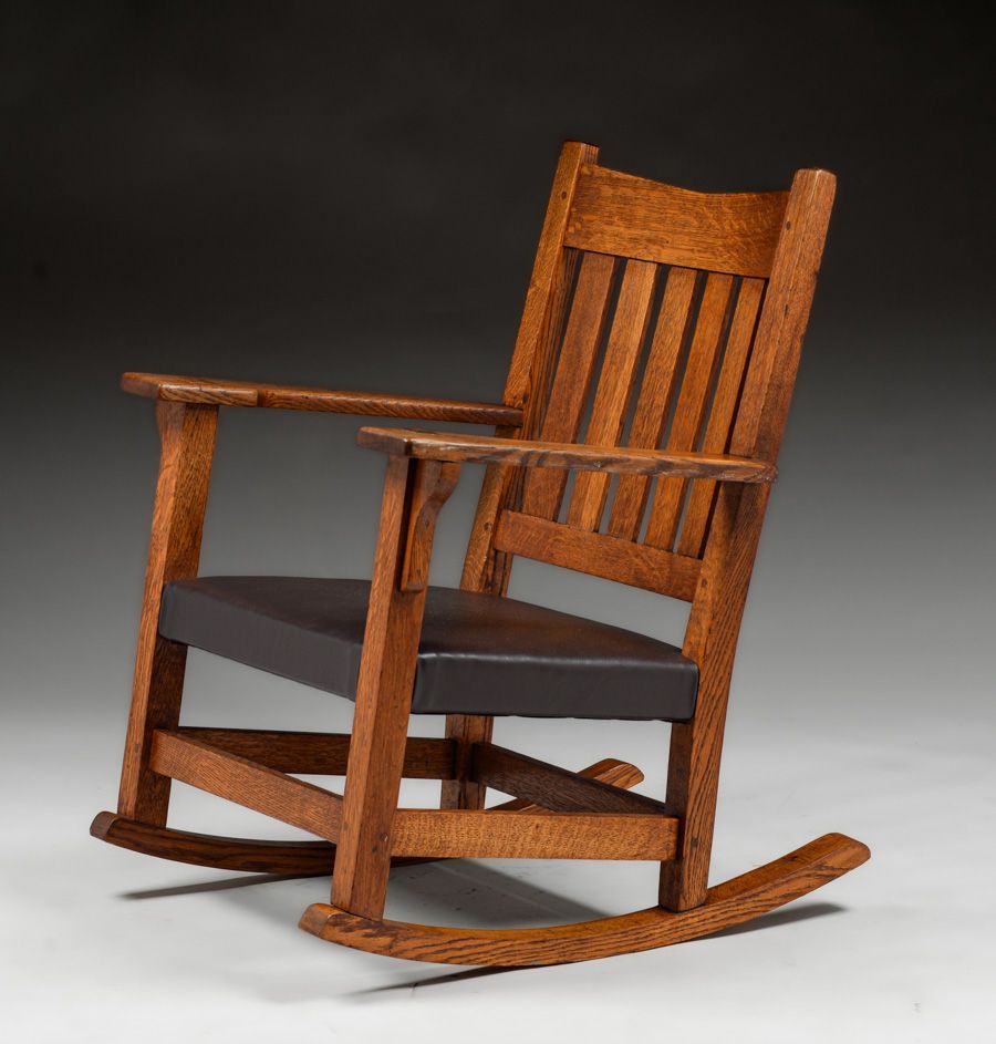 Gustav Stickley V-Back Rocker c1910. Unsigned. Very nice old refinish. Very sturdy. 33.5"h x 25.5"w x 28.25"d