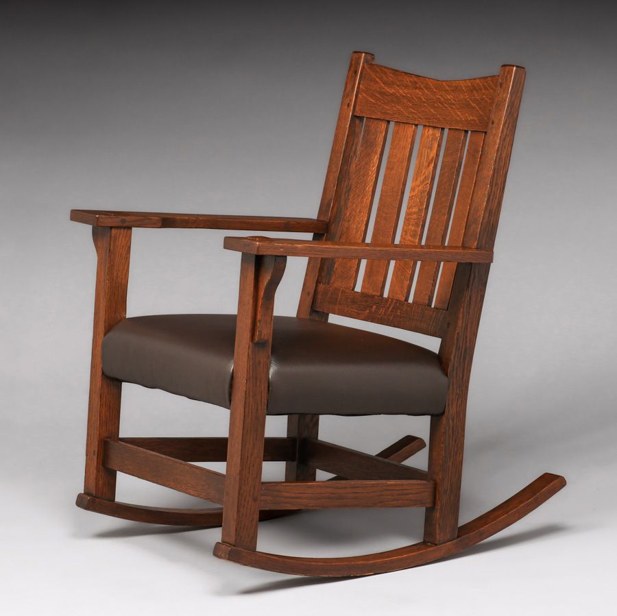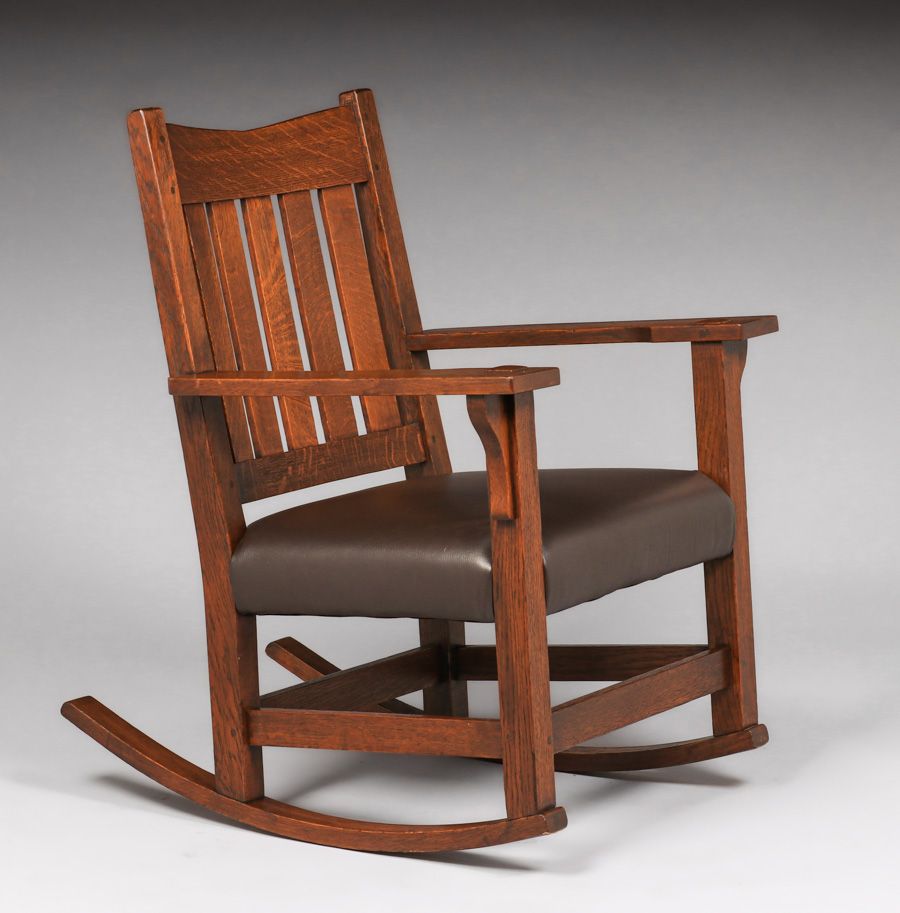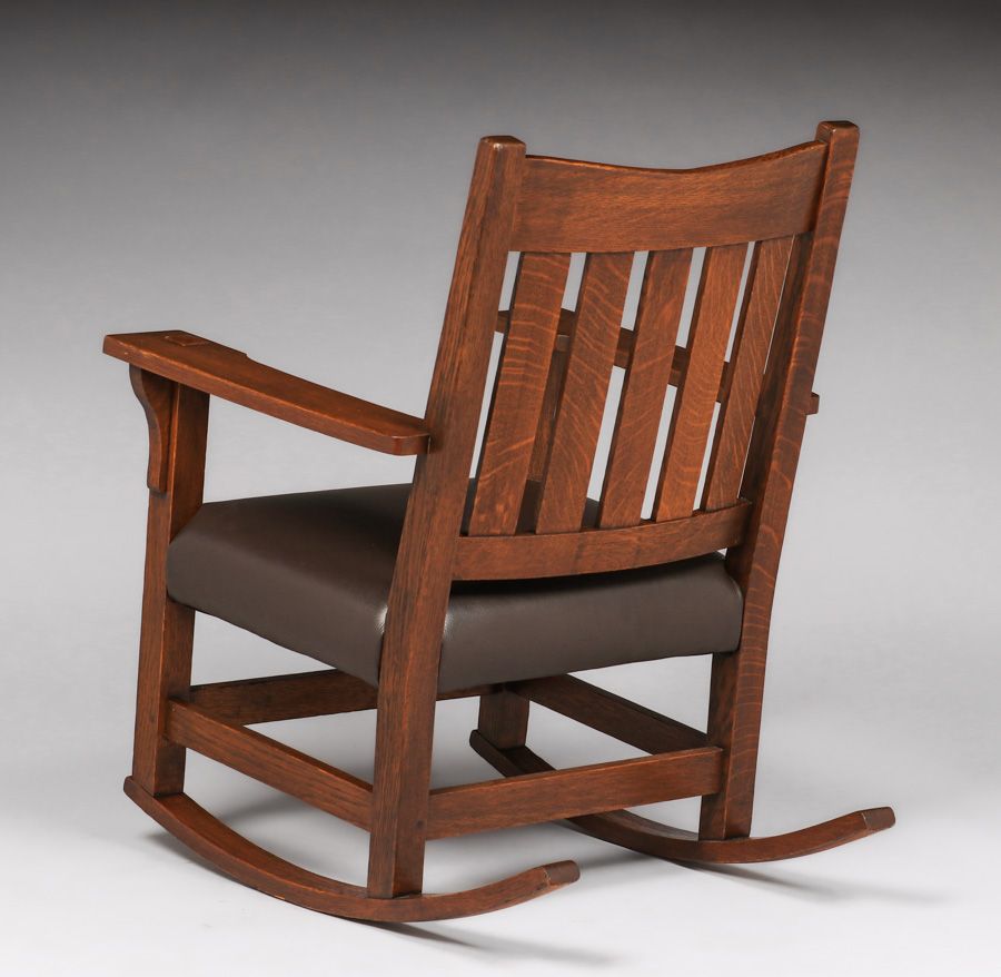 Gustav Stickley V-Back Rocker c1910. Unsigned. Very nicely refinished. Rock solid sturdy. 34″h x 26″w x 28″d SOLD