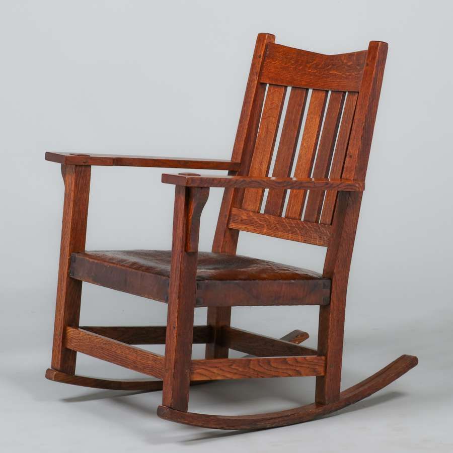 Gustav Stickley V-Back Rocker c1910. Signed. Excellent original finish and original leather. This is one of the nicest Gustav Stickley V-back rockers we have ever seen. 33.5 'h x 25.5"w x 20.5"d SOLD