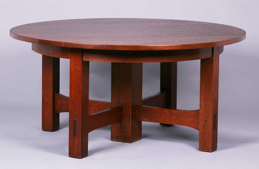 Large Gustav Stickley 60"d five-leg cross-stretcher dining table with fixed-top. Original finish to base. Top very nicely refinished. Signed with partial paper label under top. 60"d x 29"h SOLD
