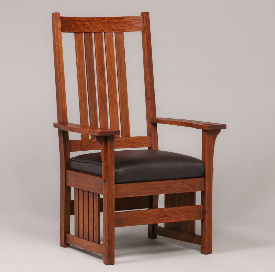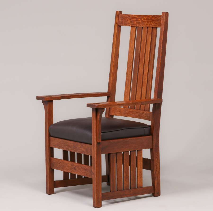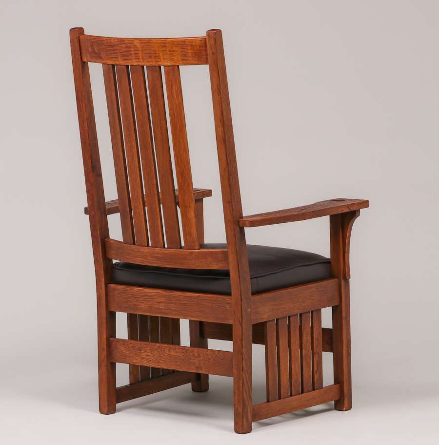 L&JG Stickley Slatted Tallback Armchair c1910. Signed. Color added to original finish. Rock solid sturdy. 44"h x 27.75"w x 24"d SOLD