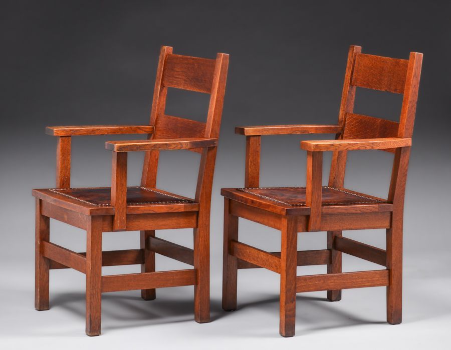 - Pair Early Gustav Stickley #1304 Armchairs c1902