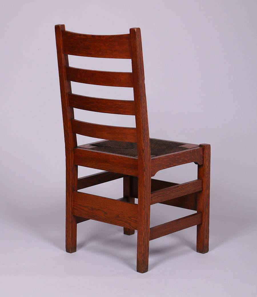 Set of 4 early Gustav Stickley tall ladder back dining chairs c1902-1904. Unsigned. Refinished. 37″h x 17.75″w x 16″d SOLD