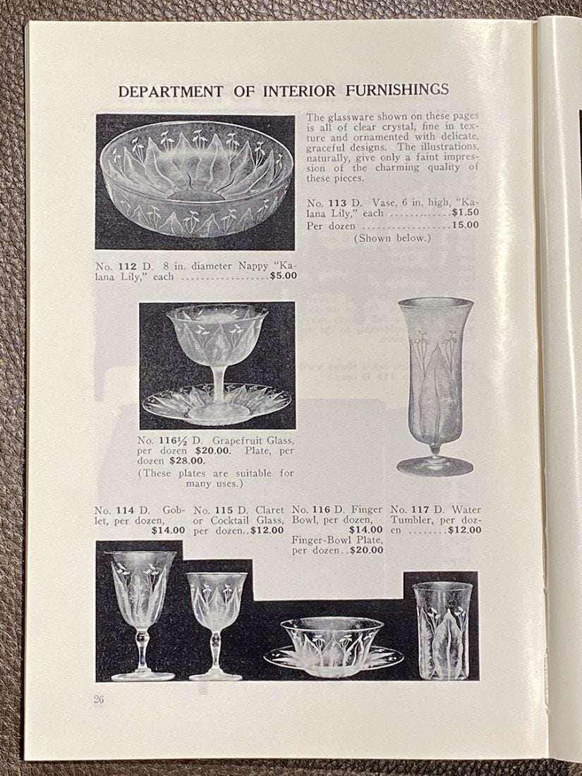 Set of 6 Gustav Stickley Lily Pattern Crystal Glasses c1915. While not produced by Gustav Stickley, this pattern was marketed by Stickley in his 1915 catalog. Perfect condition. 3 3/8"h x 4 3/8"d SOLD