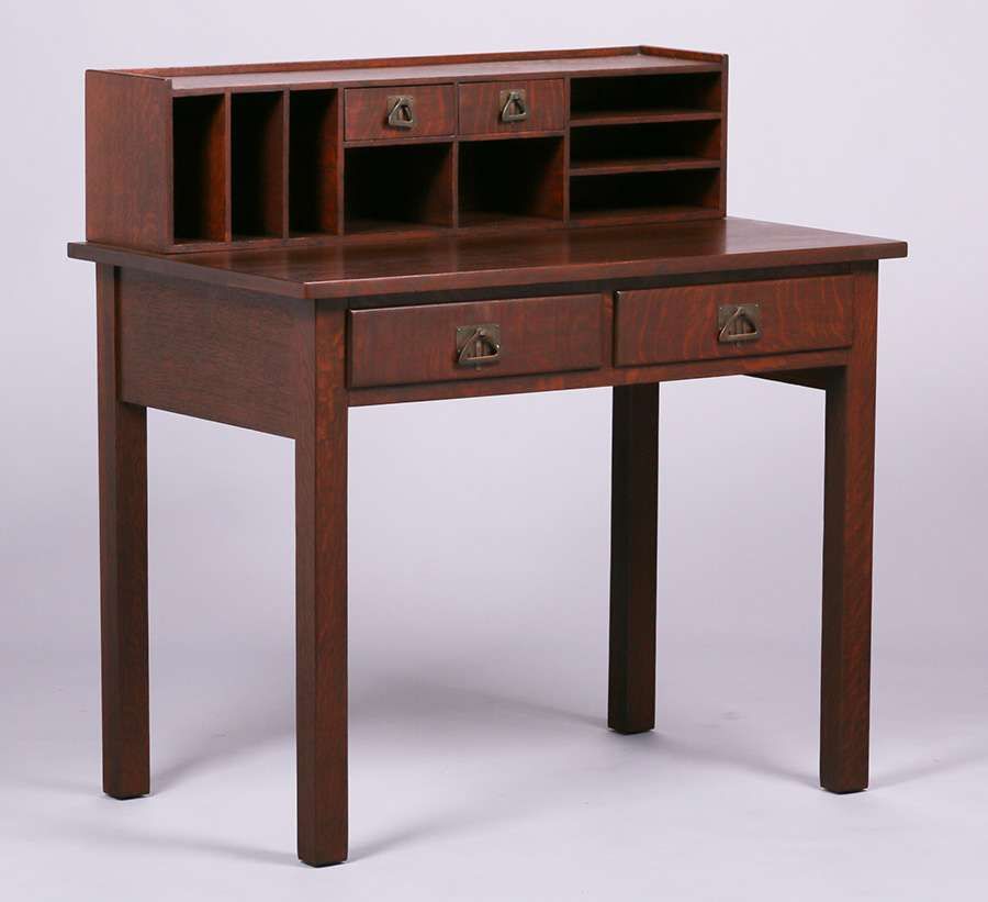 Imperial Furniture Co desk with attached letter rack on top. Unsigned. Refinished. 37.5”w x 38.5”h x 23”d SOLD