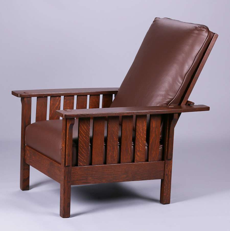 JM Young slatted morris chair similar to the L&JG Stickley #471. Unsigned. Refinished. 40"h x 31.5"w x 35.5"d SOLD