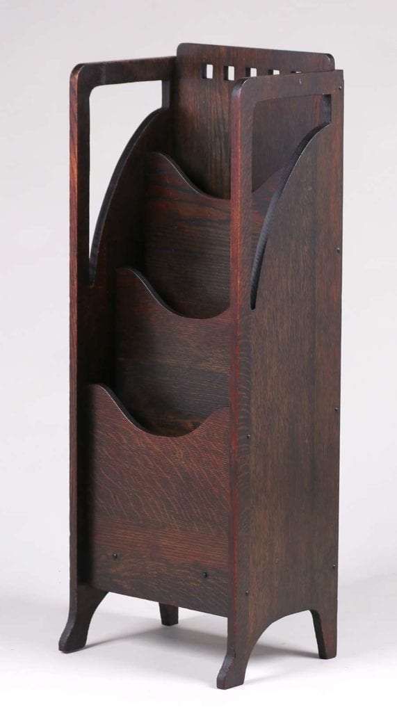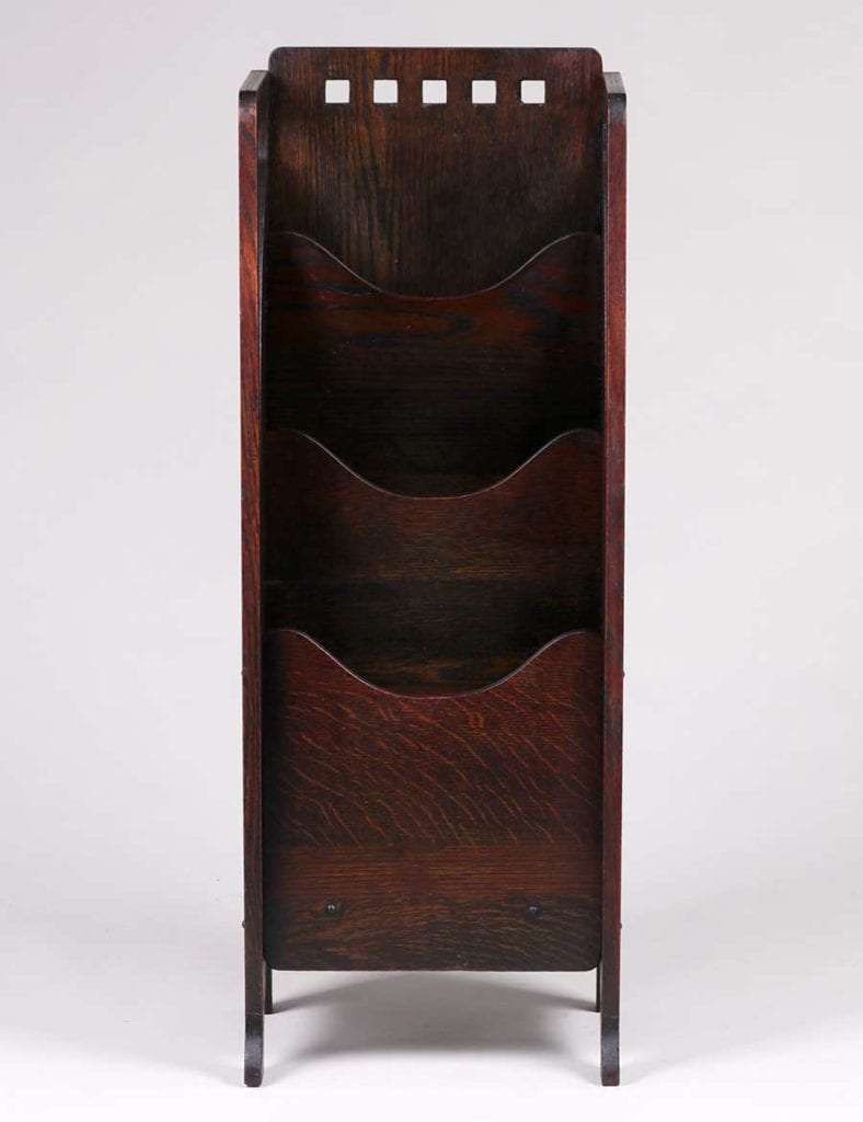 Lakeside Crafts Shop cutout magazine stand c1910. Unsigned. Excellent original finish. 38.25″h x 14.25″w x 9.5″d SOLD