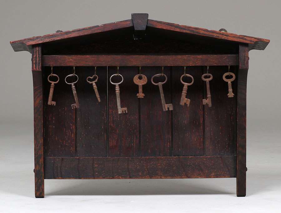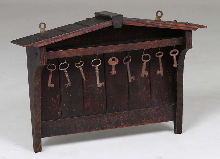 Lakeside Crafts Shop Hanging Key Rack c1910. Unsigned. Excellent original finish. 12"h x 17.5"w x 4.25"d SOLD