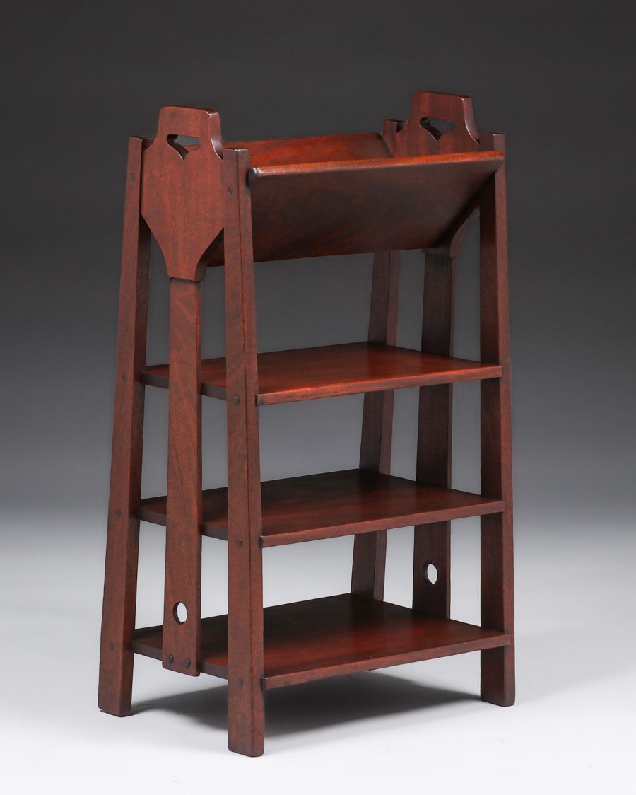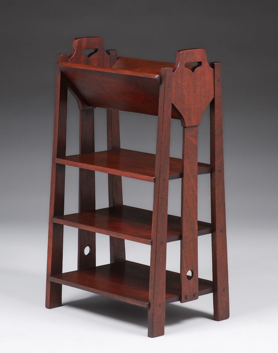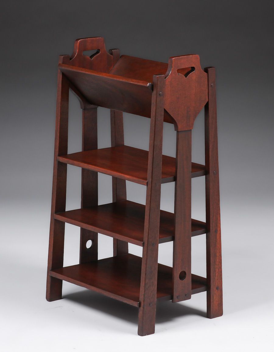 Lakeside Crafts Shop – Sheboygan, WI Mahogany Book Trough Magazine Stand c1910. Signed. Very nicely refinished. 33″h x 18.5″w x 13″d $1500