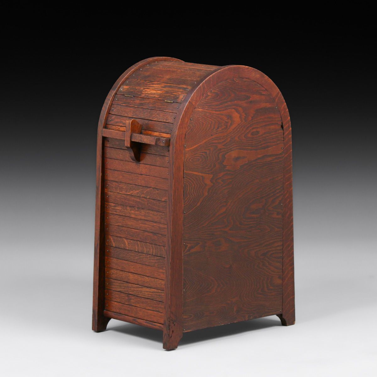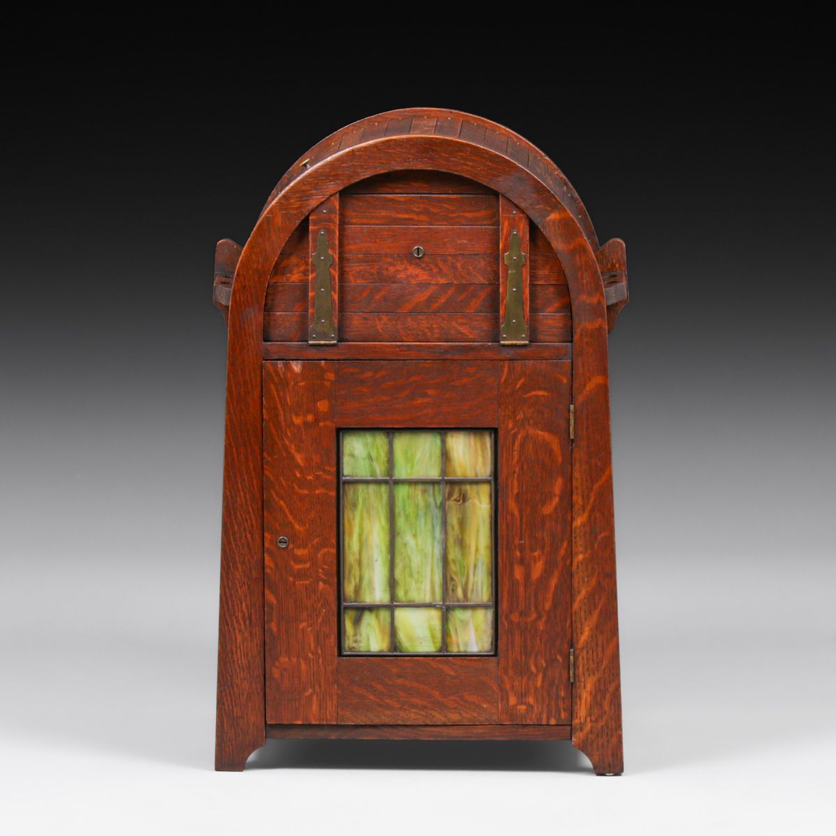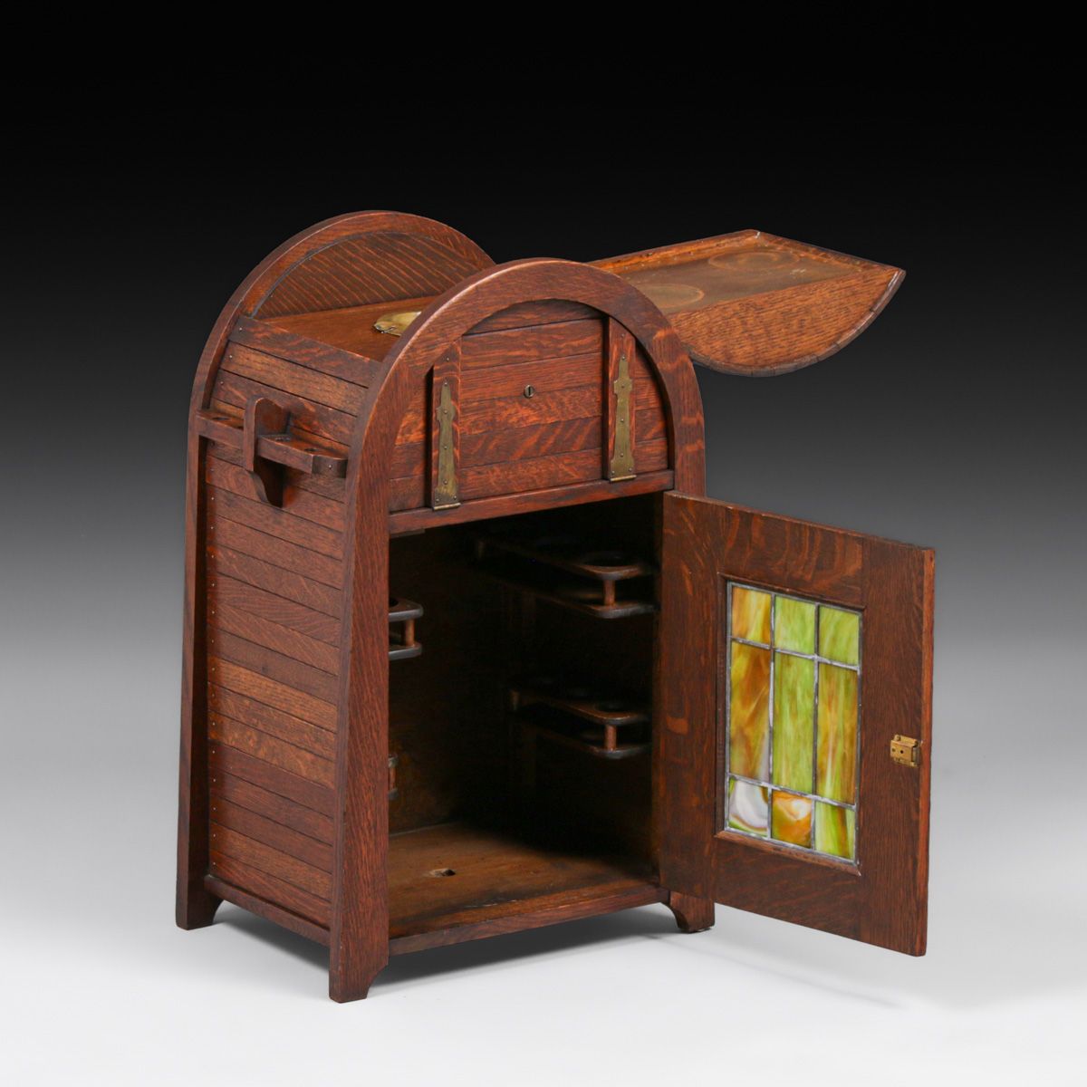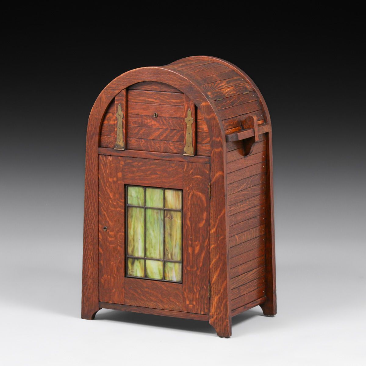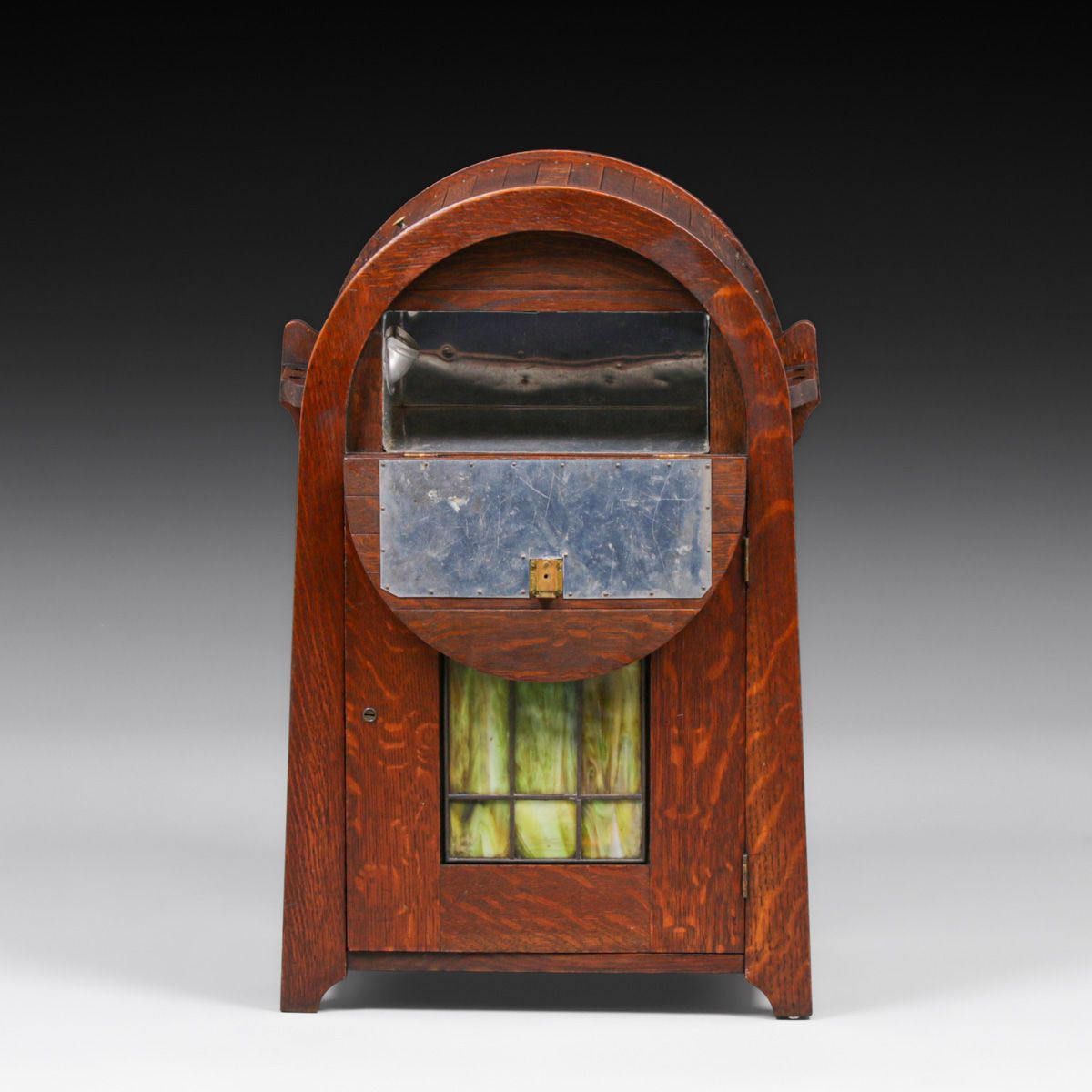 Lakeside Crafts Shop - Sheboygan, WI Oak & Green Slag Glass Cellarette c1910. Unsigned. Excellent original finish. 29.5"h x 18.75"w x 12.75"d