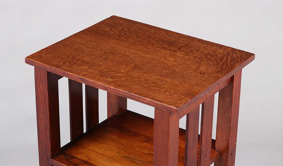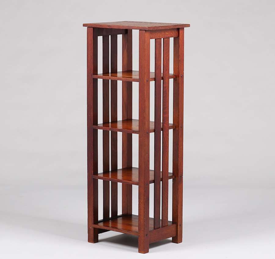 Lakeside Crafts Shop - Sheboygan, WI tall magazine stand bookshelf c1910. Signed. Top refinished to match original finish base. 43.25"h x 16"w x 13" SOLD