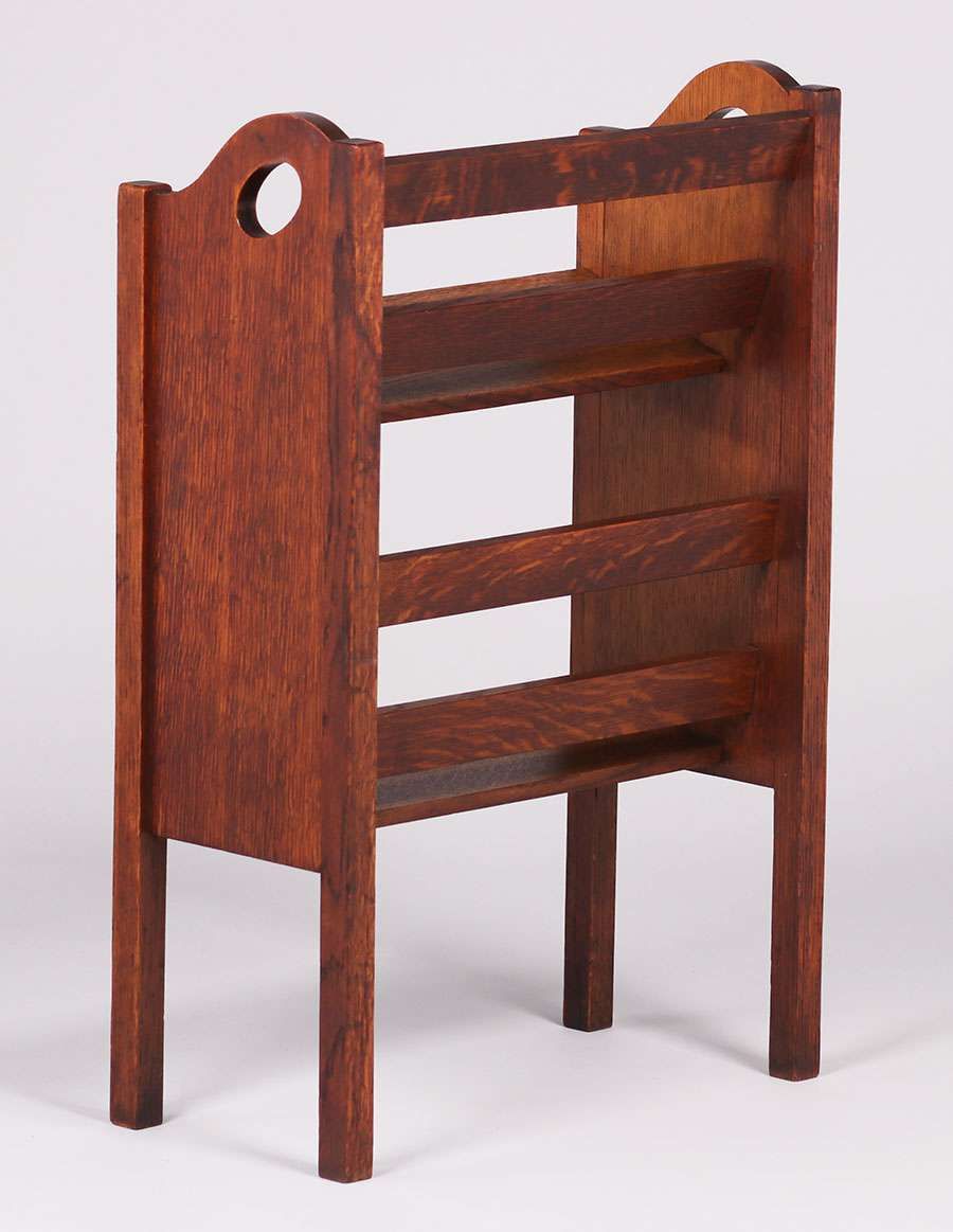 Small Lakeside Crafts Shop magazine stand bookshelf with cutout handles. Unsigned. Excellent original finish. 28.75″h x 18.75″w x 9.25″d SOLD