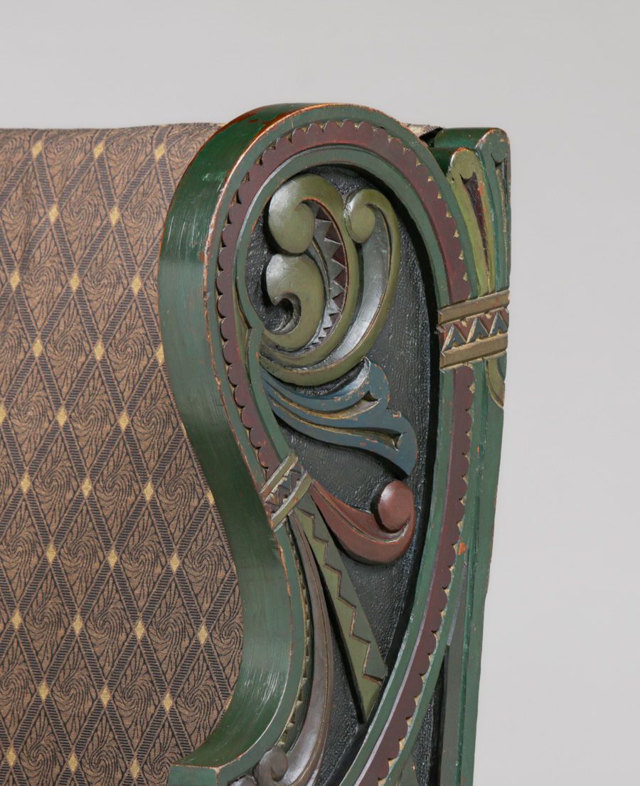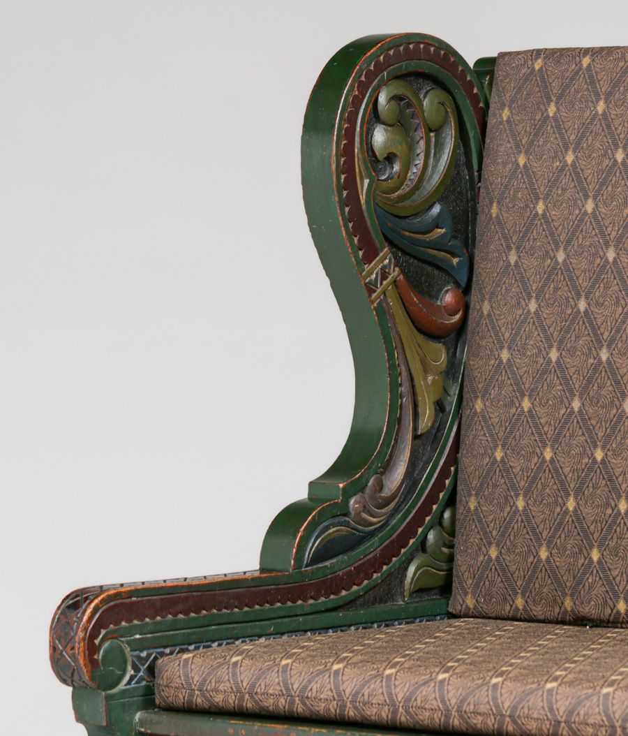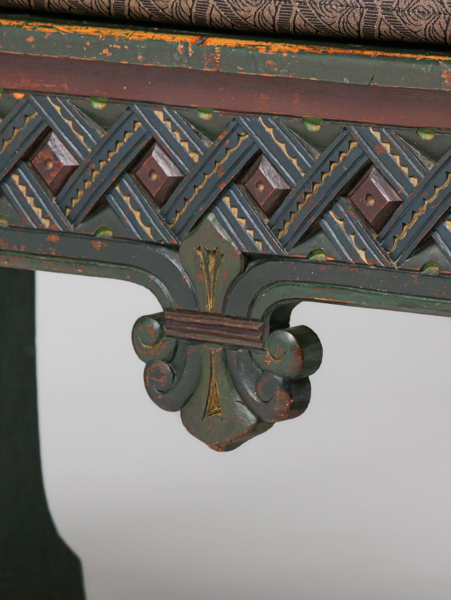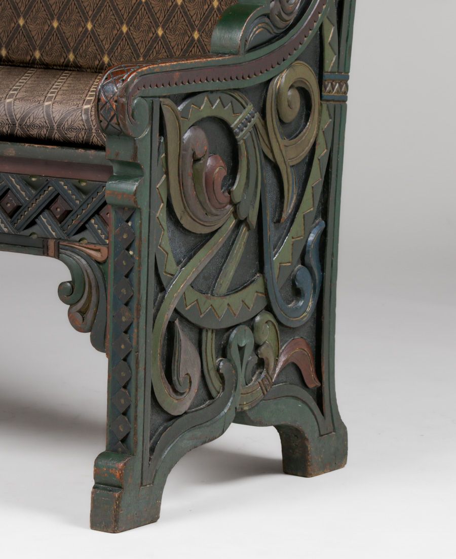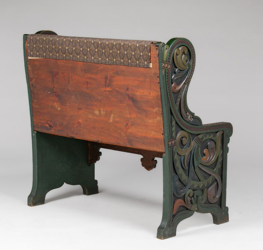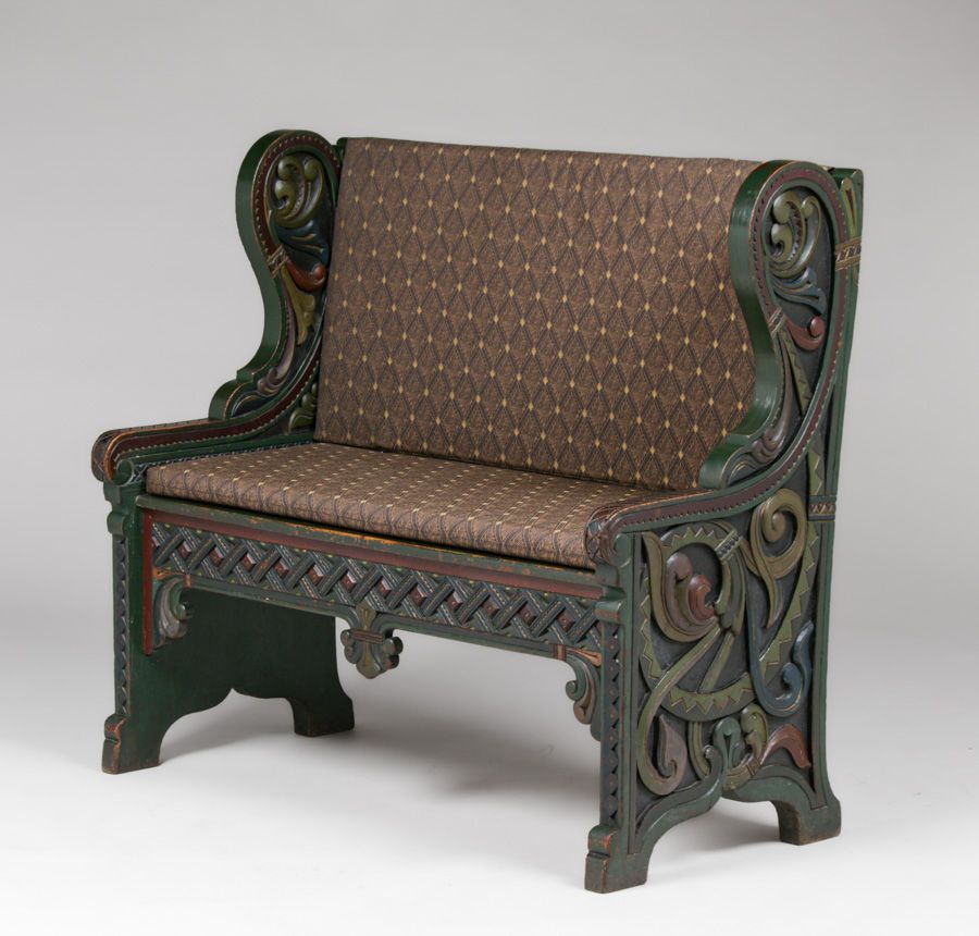 Lars Kinsarvik (1846-1925) Hand-Carved & Painted Bench c1900s. Kinsarvik was a woodcarver, writer and folk musician and is credited as the creator of the Norwegian style. Unsigned. Excellent original paint in extraordinary condition. Very sturdy. 45"w x 42"h x 22"d