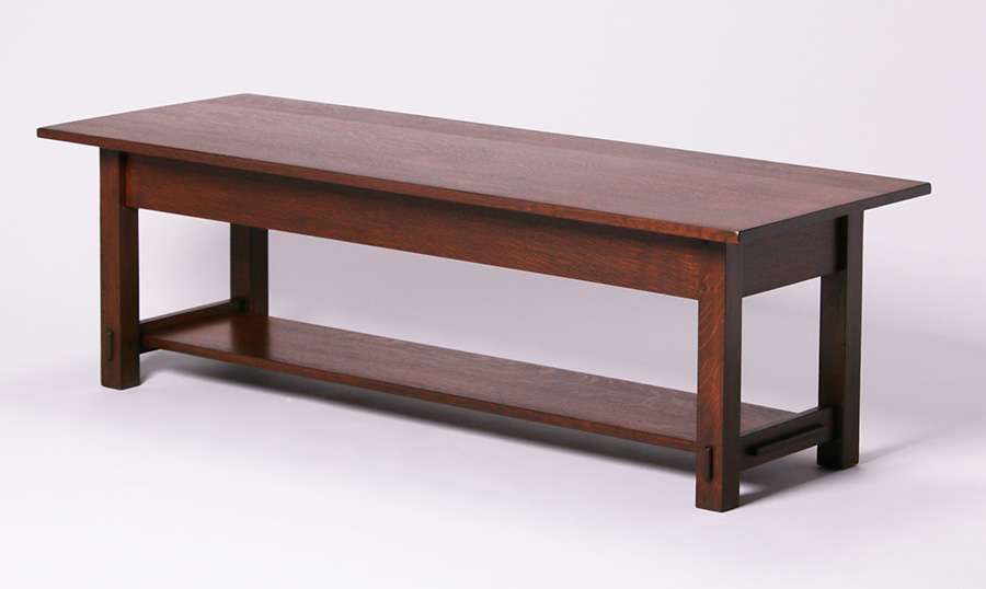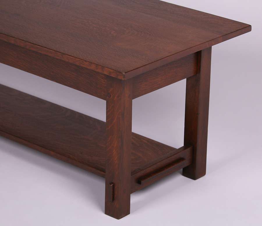 Arts & Crafts coffee table, probably home built c1910. Design is similar to Lifetime Furniture. Unsigned. Refinished. 59.5"w x 21.5"d x 18.5"h SOLD