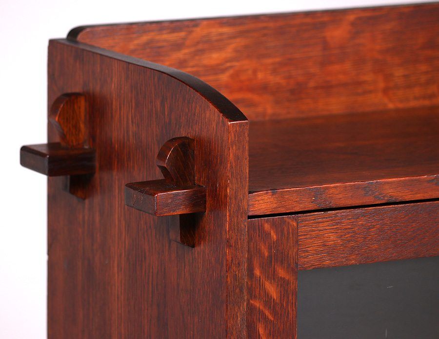 Lifetime Furniture Co one-door bookcase with tenon & key construction c1910. Excellent original finish. Outline of paper label. 44.5"h x 26.5"w (30"w with tenons) x 12"d SOLD