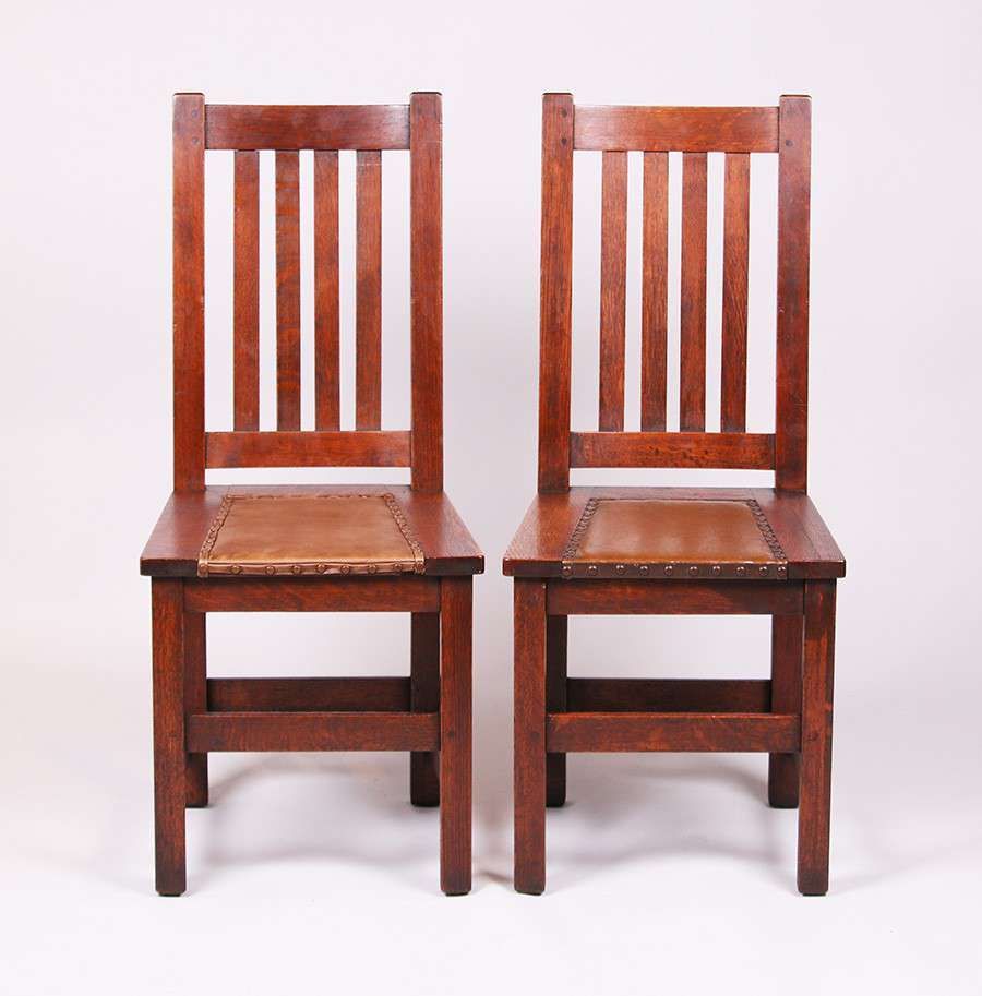 5 Limbert Dining Chairs each with four vertical slats. Excellent original finish. Signed. 3 with original leatherette upholstery and two redone to be similar. 39"h x 17.25"w x 17"d SOLD