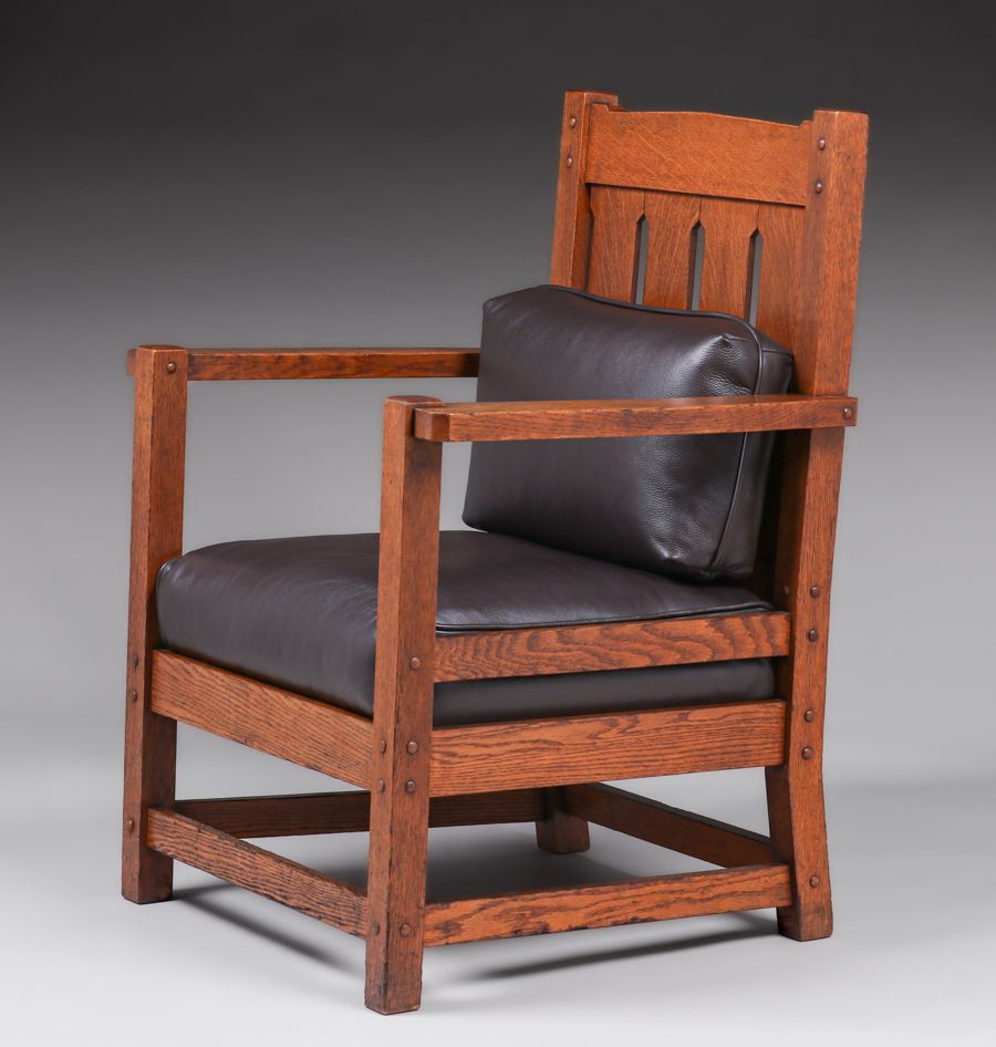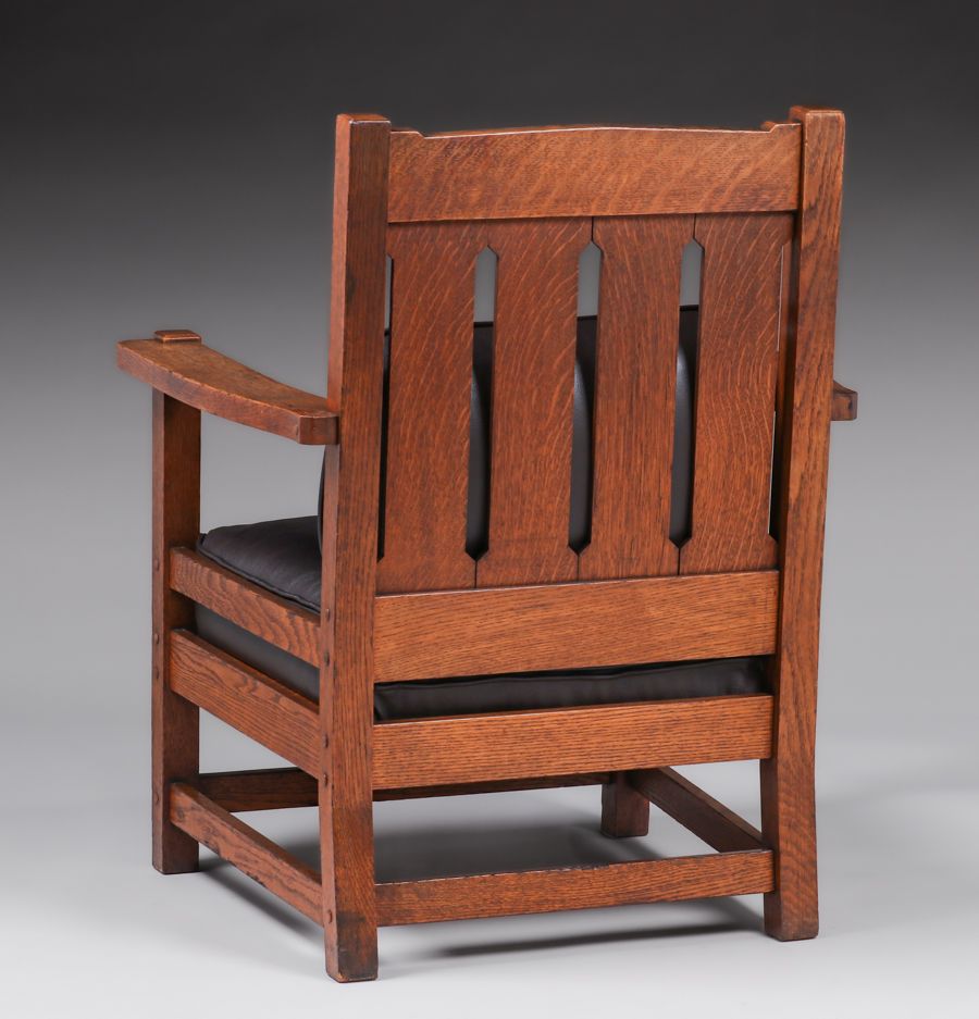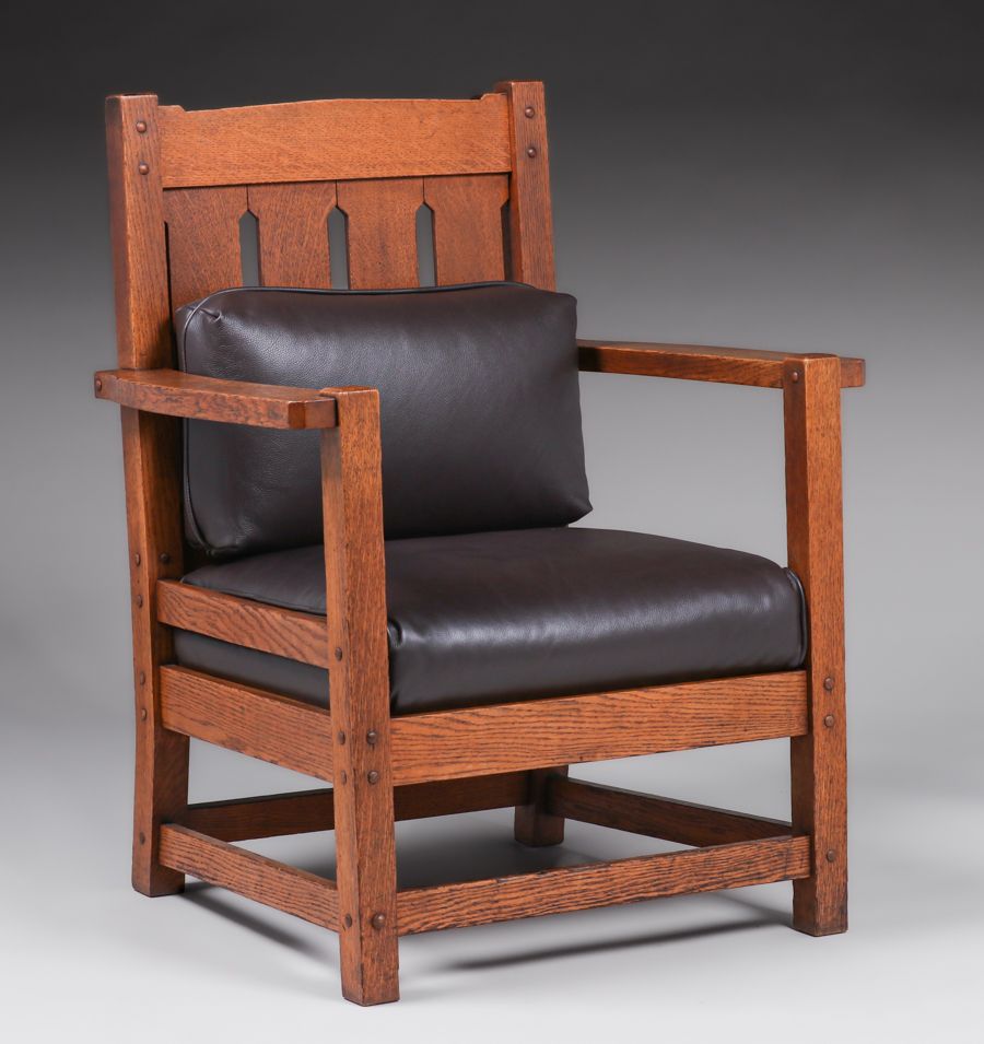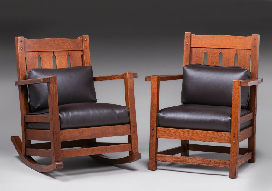 Early Limbert #853 Armchair & #854 Rocker c1903. Unsigned. Excellent original finish. Rock solid sturdy. Armchair 38.25"h x 30"w x 24"d. Rocker 37.25"h x 29.5"w x 24.25"d SOLD