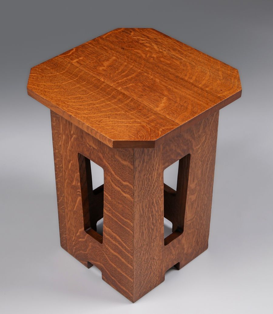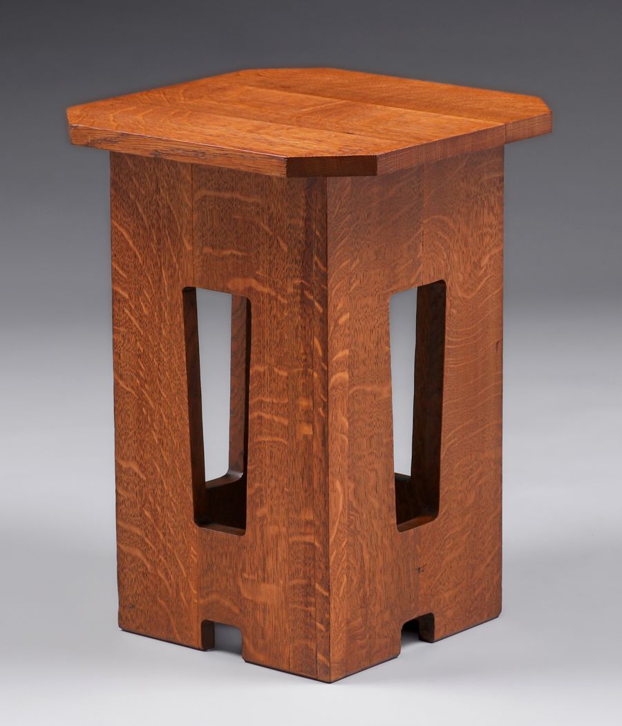 Early Limbert Cutout Taboret c1902-1904. Signed with early paper label before they expanded to Holland, Michigan. Excellent original finish. 20h x 15 x 15 inches SOLD