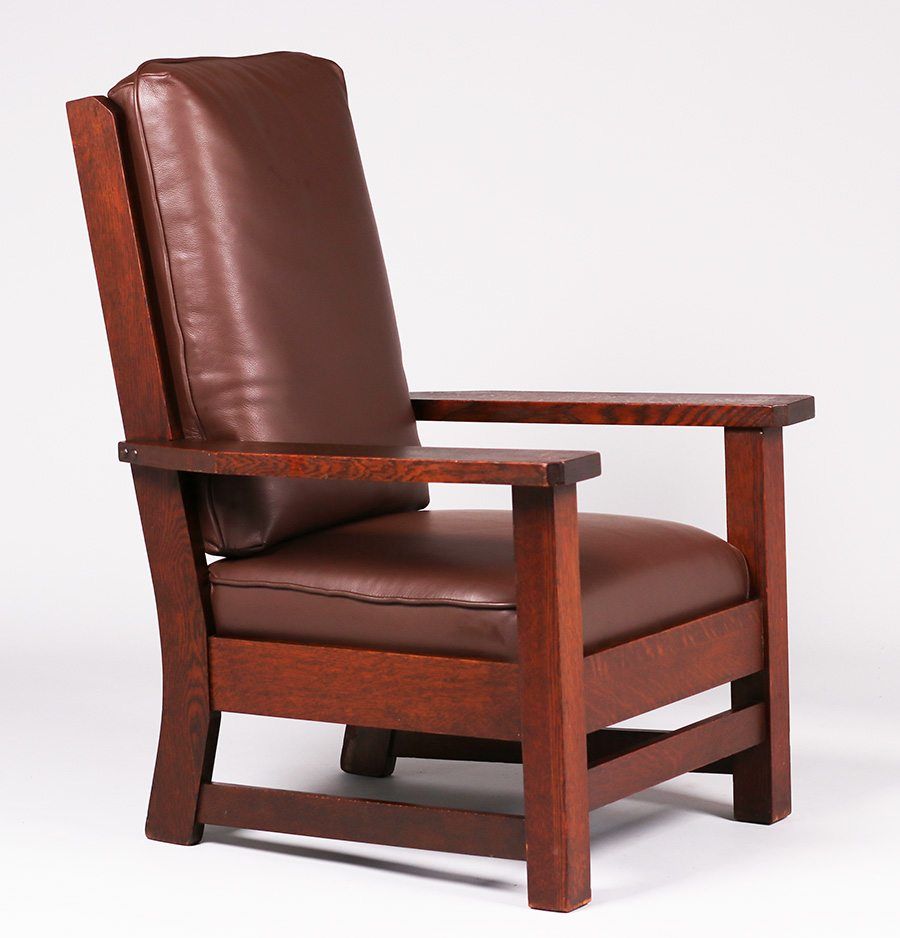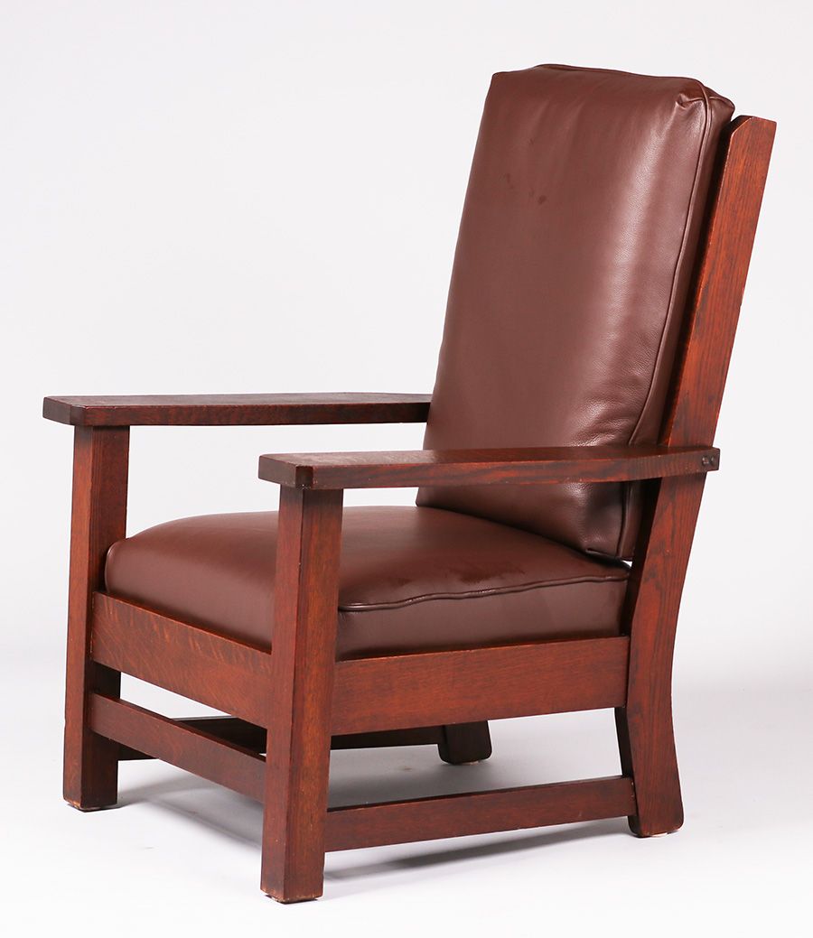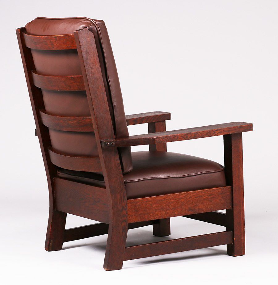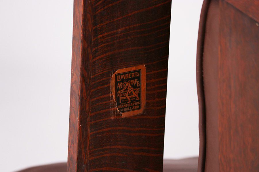 Early Limbert heavy armchair c1902-1905. Signed with early paper label. Excellent original finish. 42"h x 30"w x 30"d SOLD