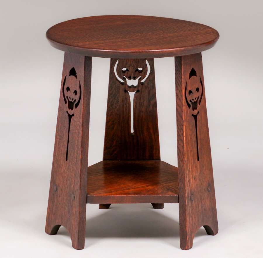 Early Limbert Jack-O-Lantern Cutout Taboret c1905. Signed with paper label. Very nicely refinished. One of the rarest forms of early Limbert taborets. 18"h x 15"d SOLD