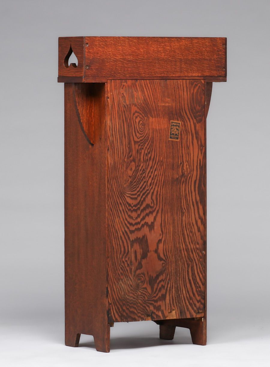 Early Limbert Spade Cutout One-Door Bookcase c1902-1905. Signed with paper label. Excellent original finish. 44″h x 24″w x 13″d $7500