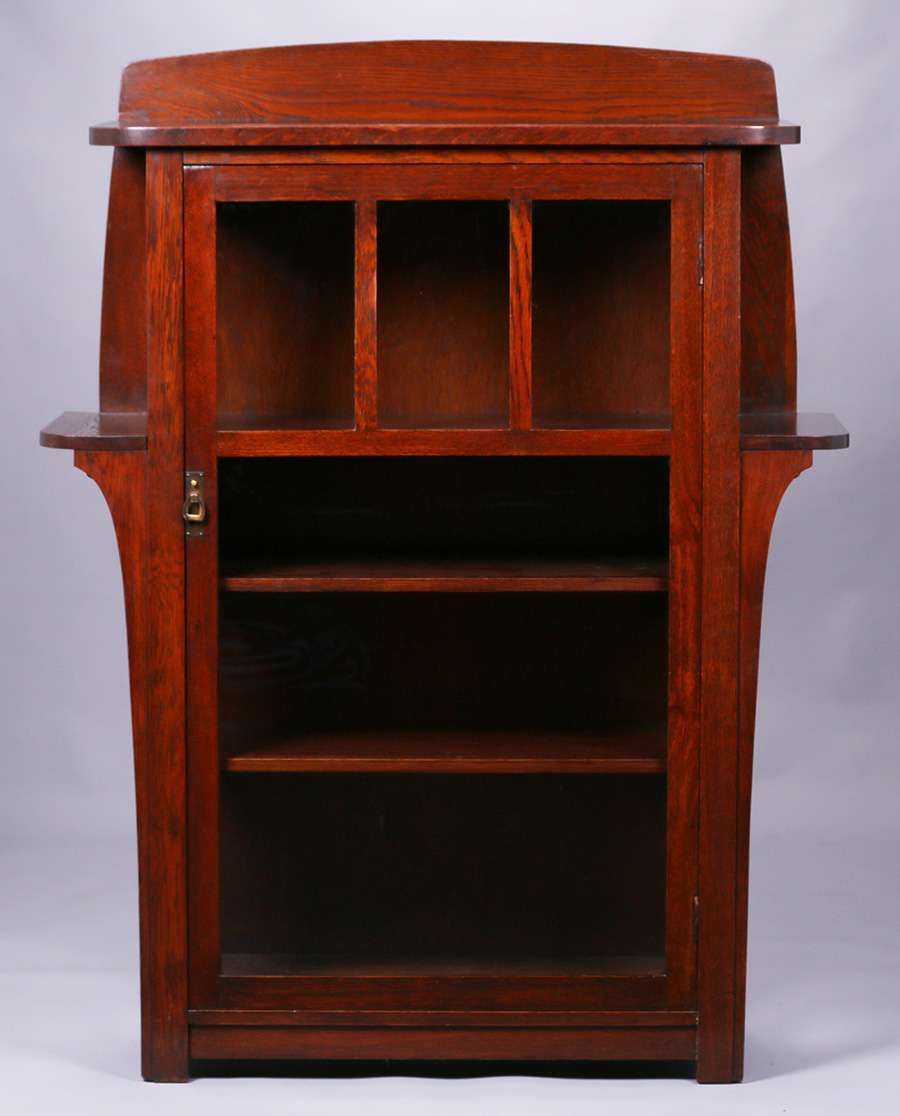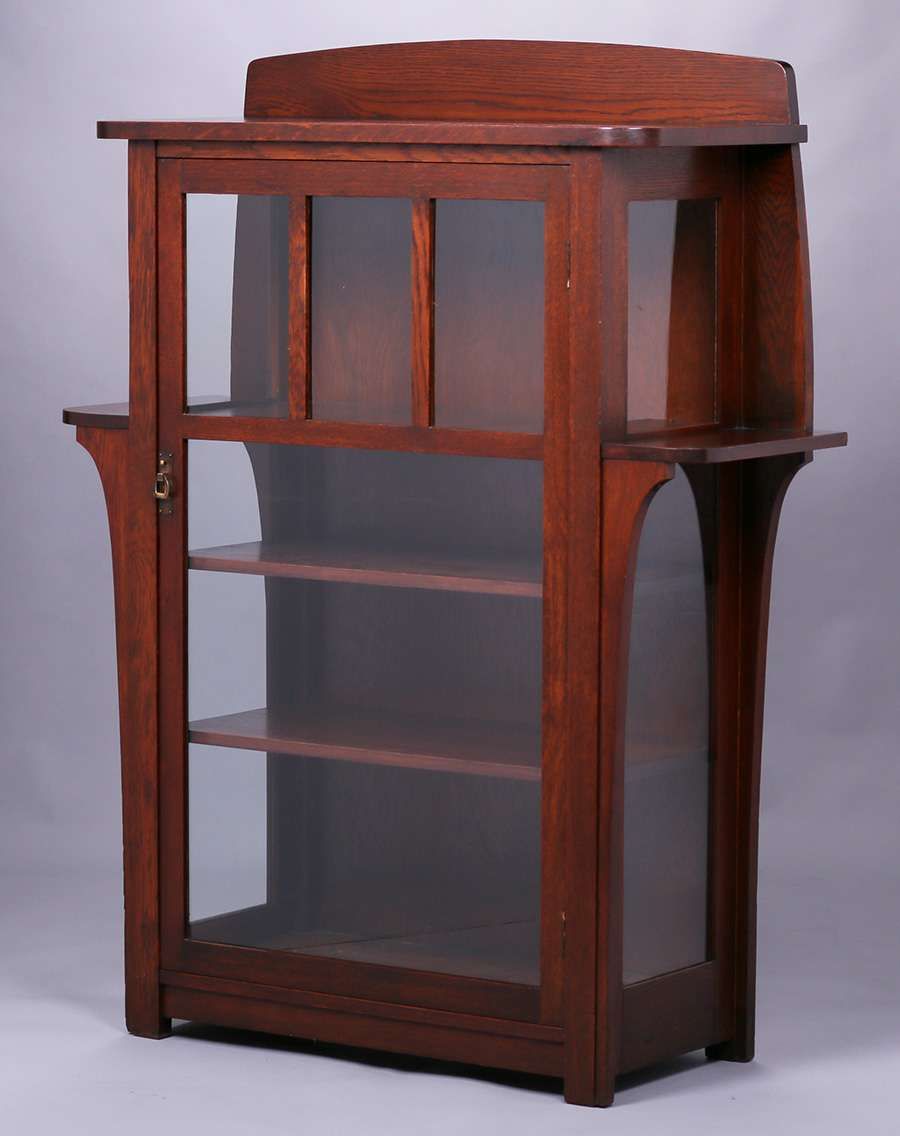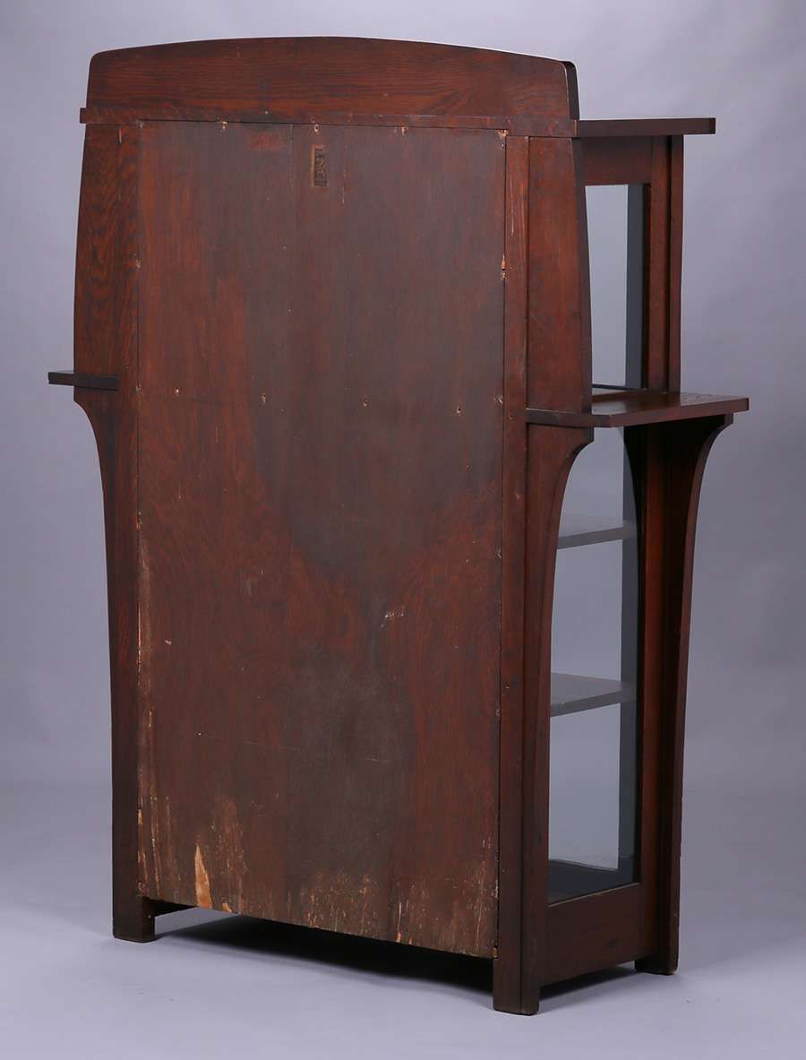 Limbert one-door china cabinet #452. Signed. Excellent original finish (except top surfaces refinished). 57.75″h x 44.5″w x 15.5″d SOLD
