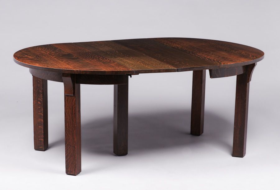 Limbert 48"d Oak Five-Leg Dining Table c1910. Complete with six original 11"w leaves. Signed. Excellent original finish. 48"d x 29"h. Expands to 114" x 48" $7500