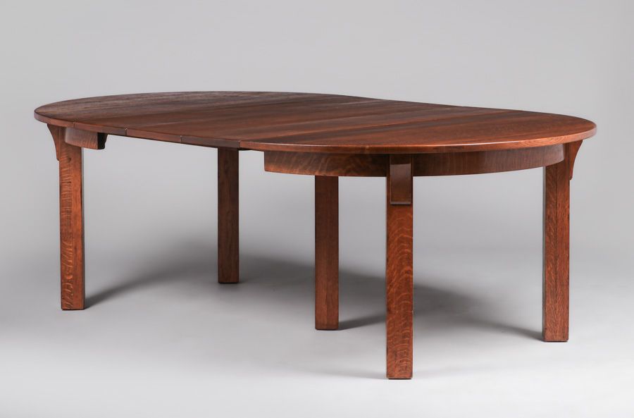 Limbert 54"d Five-Leg Dining Table c1910. Six original 11"w leaves. Unsigned. Very nice old refinish. 54"d x 29.25"h (extends to 120" x 54" with leaves) $7500