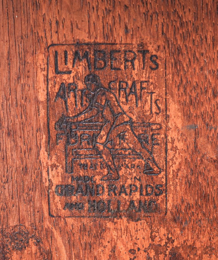Limbert 54"d Pedestal Dining Table c1910. Signed with branded mark. Four original 11"w leaves. Excellent original finish. 54"d x 29"h (extends to 98" x 54") SOLD