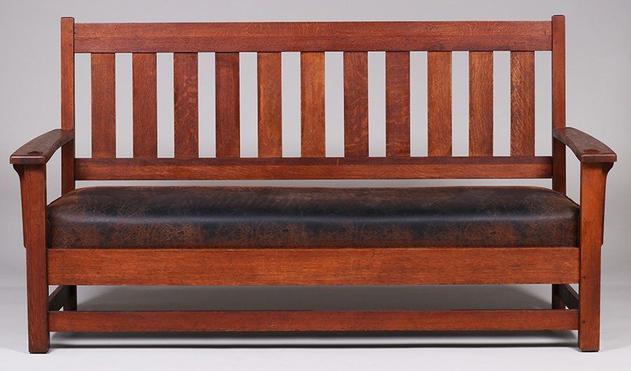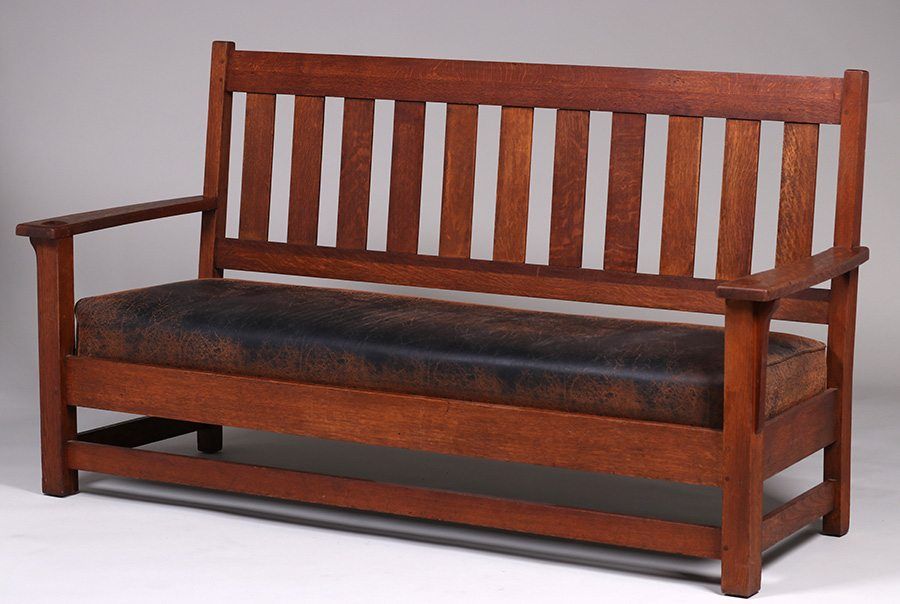 Limbert bench settle c1910. Signed with branded mark. Original finish. Very sturdy. New fabric looks like old leather. 74"w x 40"h x 27"d SOLD