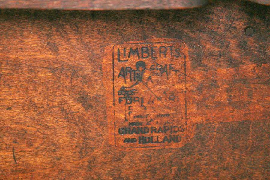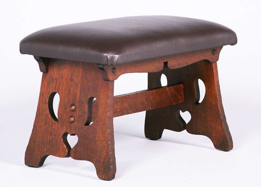 Limbert cutout ticket stool with upholstered seat. Excellent original finish. Signed. 20.5"w x 12.5"d x 13"h SOLD