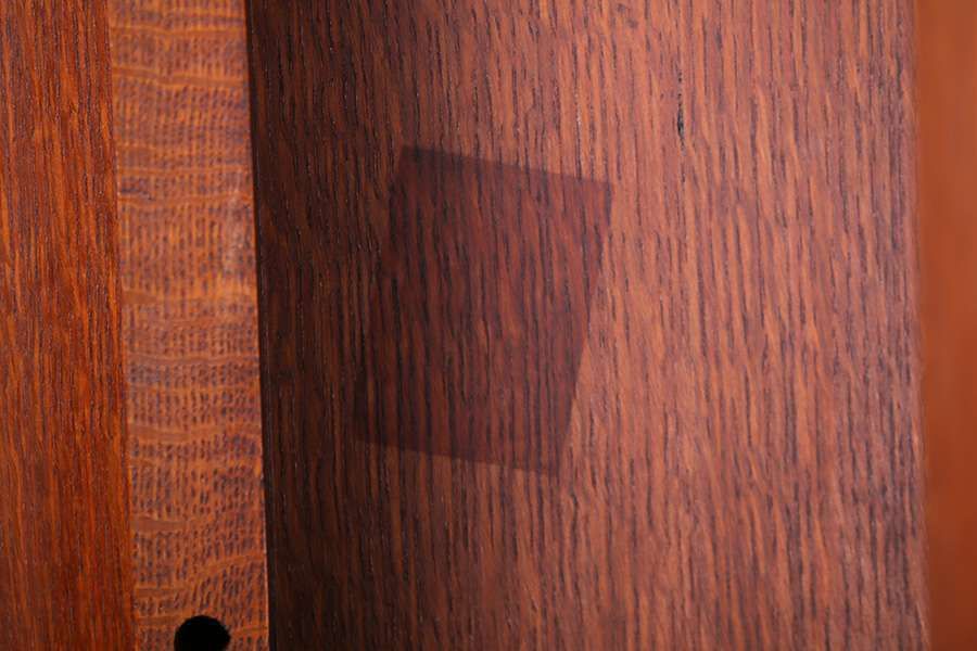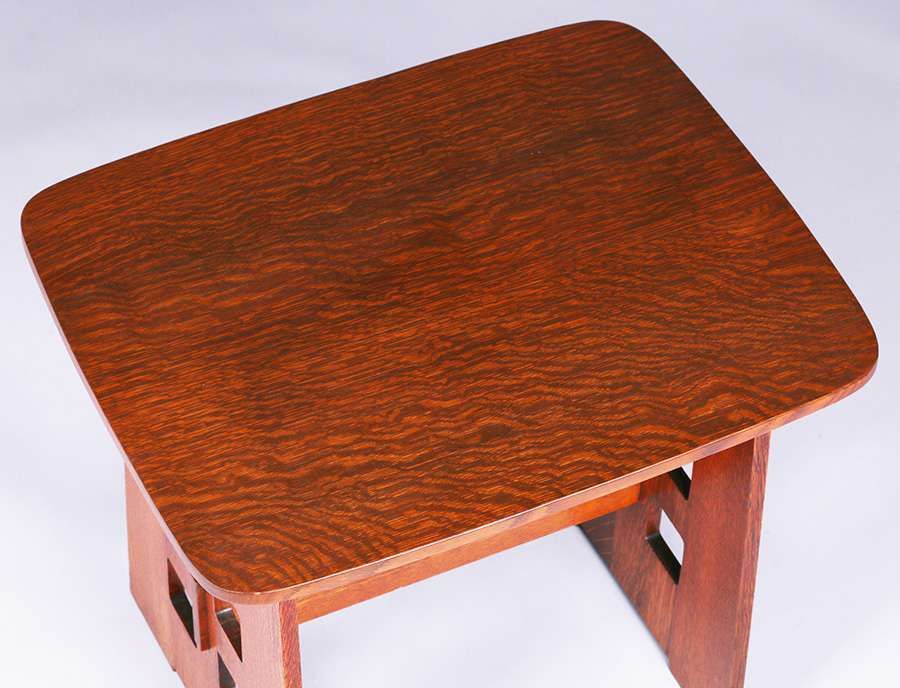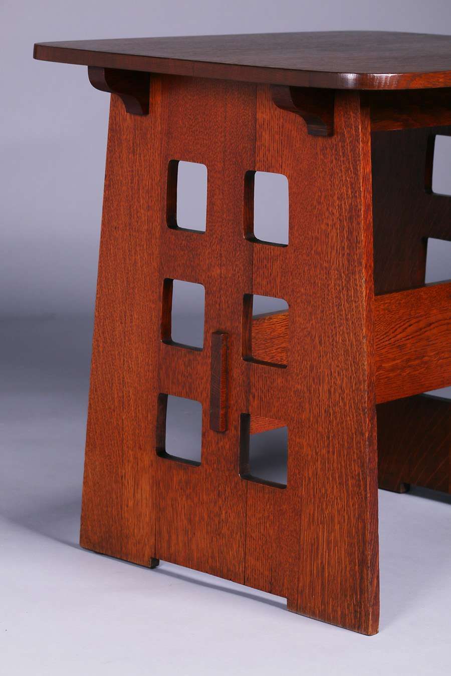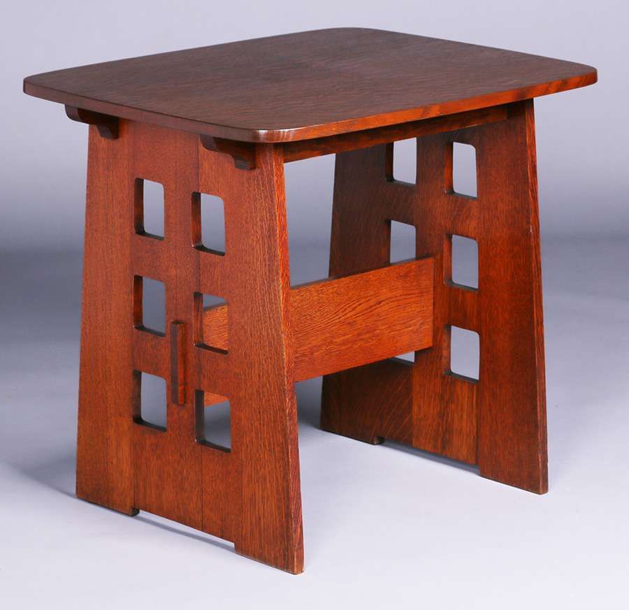 Limbert cutout cafe table with six cutouts on each side c1902-1905. Outline of paper label under top. Original finish except top refinished. 30"w x 24" x 27"h SOLD