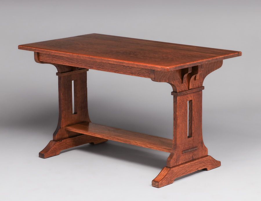 Limbert Cutout Prairie School Trestle Table c1910. Signed with branded mark. Excellent original finish. Rock solid sturdy. 50"w x 28"d x 29"h SOLD