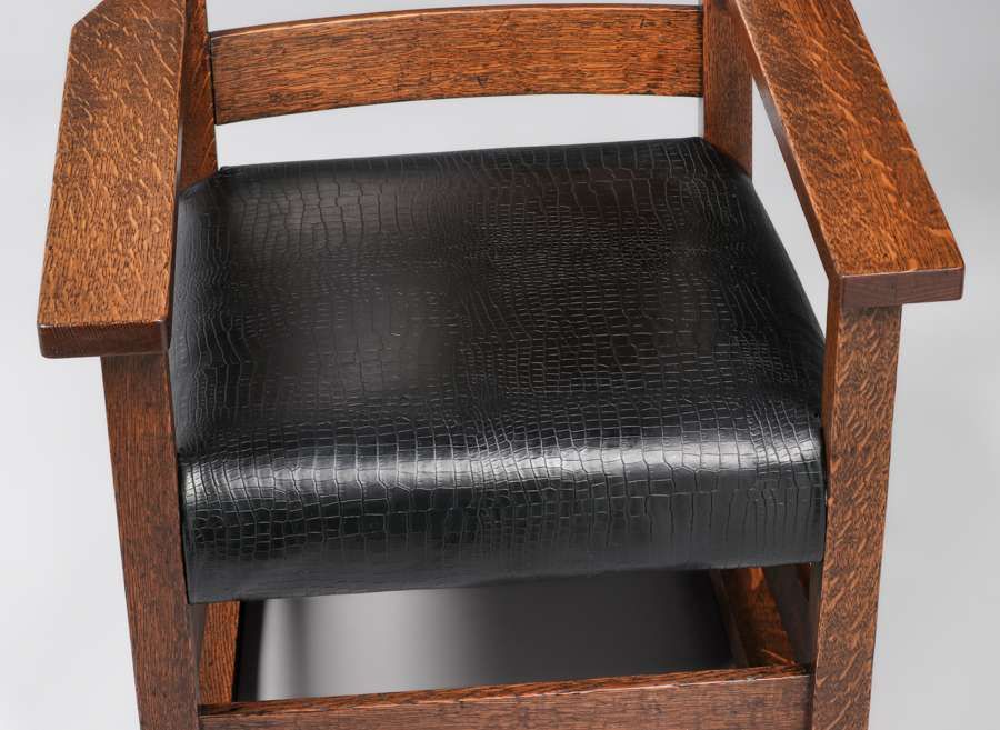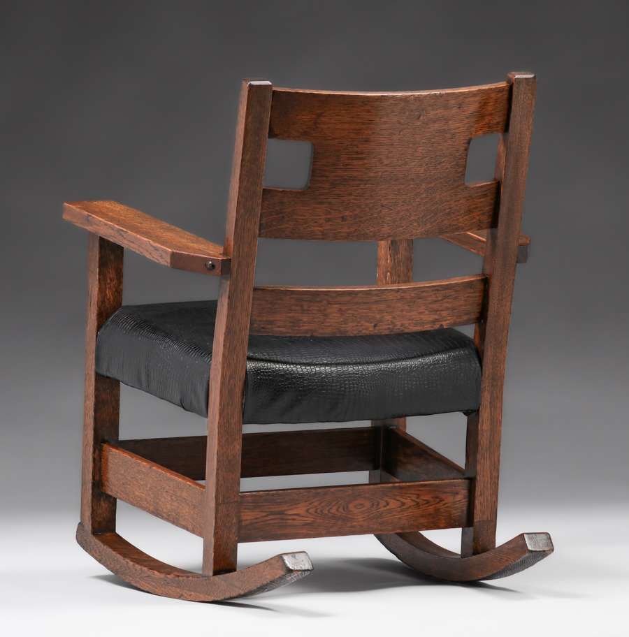Limbert Cutout Rocker c1905. Signed with early paper label. Excellent original finish. 31”h x 24”w x 28”d SOLD