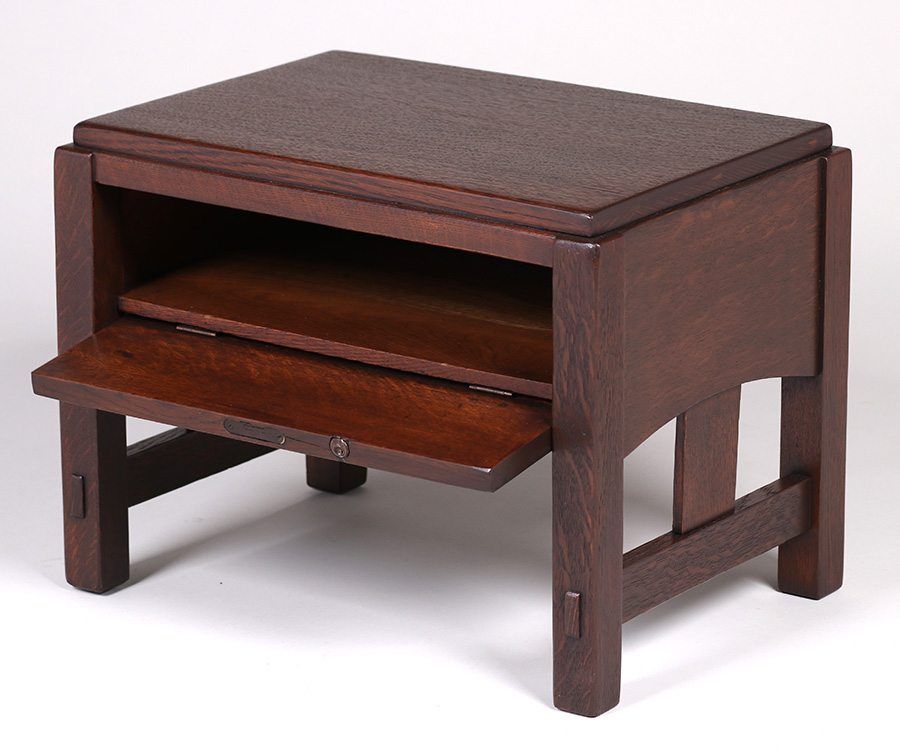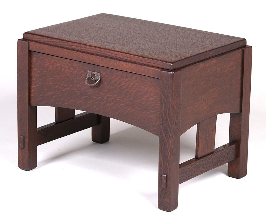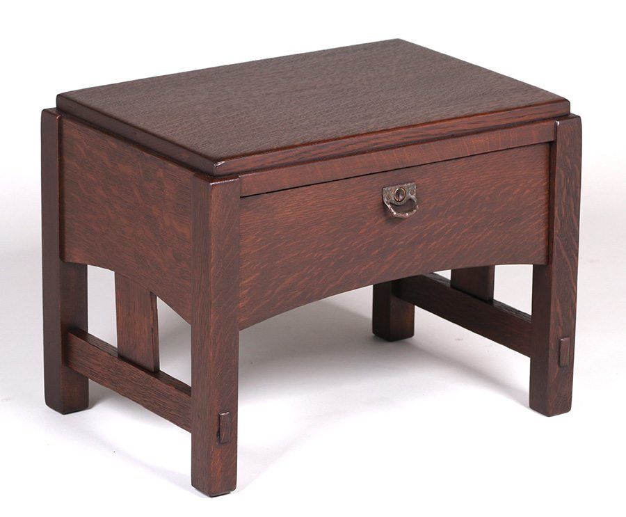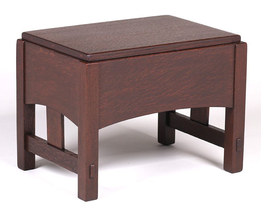 Unusual Limbert footstool with drop front compartment. Signed with branded mark. Very nicely refinished. 20"w x 14"d x 15.25"h SOLD