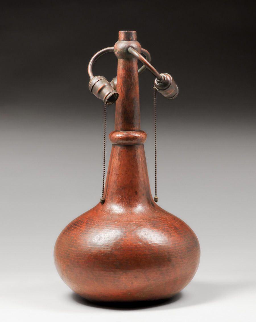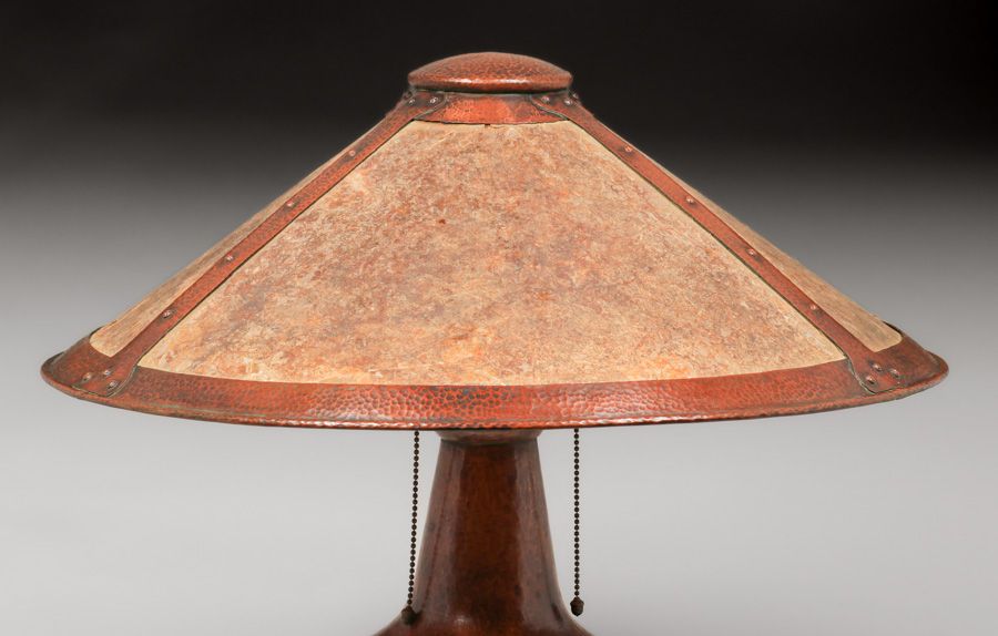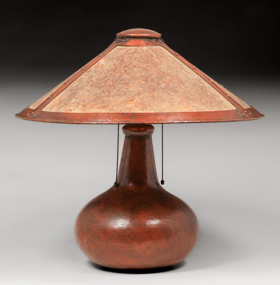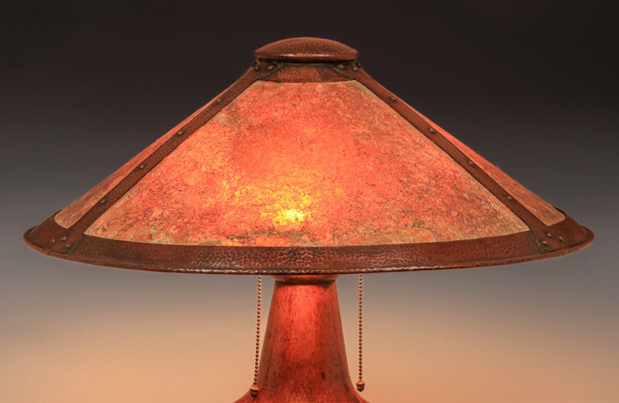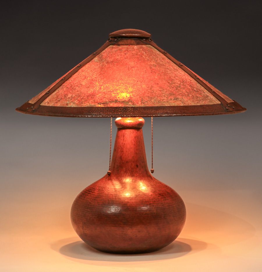 Limbert Hammered Copper & Mica Lamp c1910. Unsigned. Color added to original patina. Excellent original mica. 23"d x 21"h SOLD