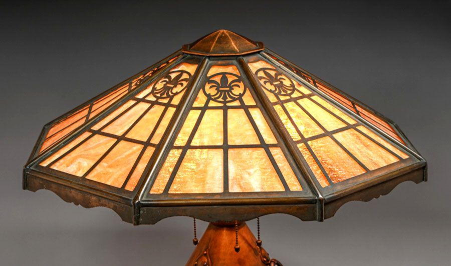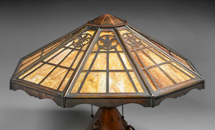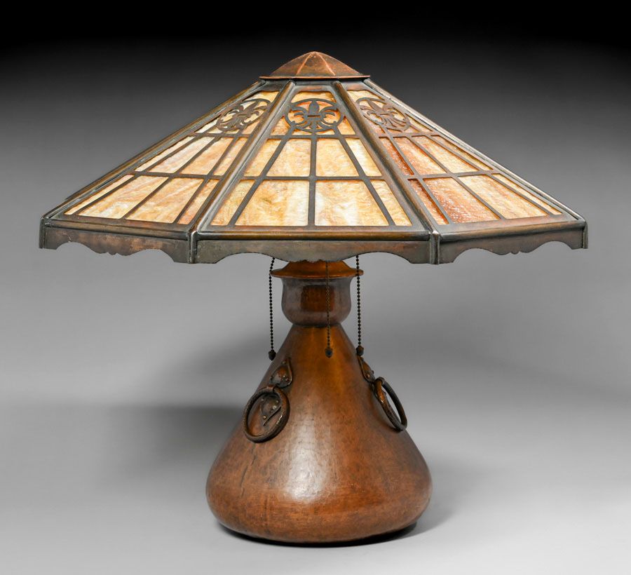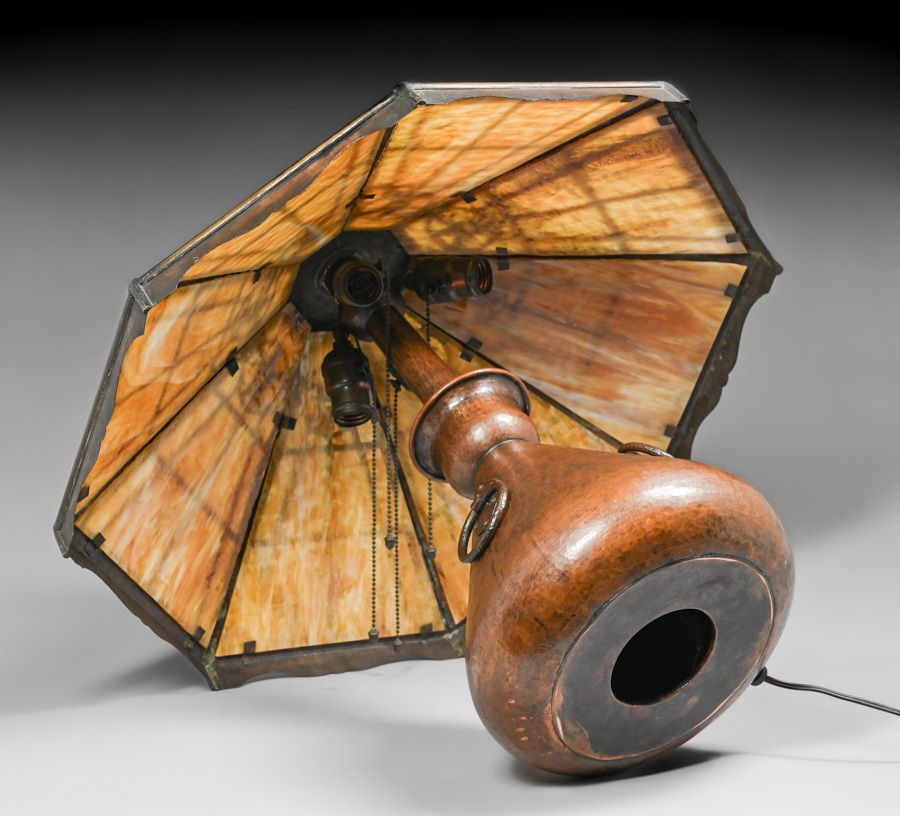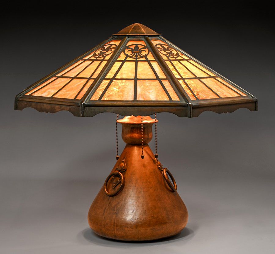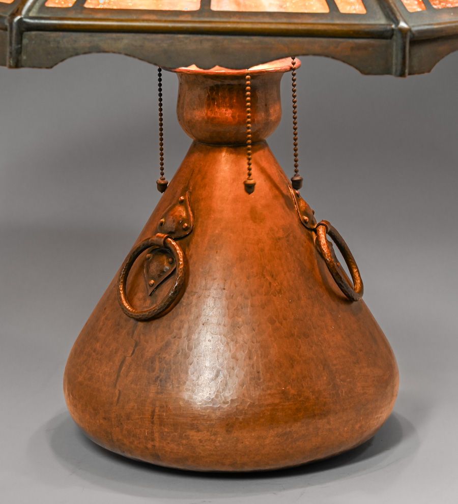 - Limbert Hammered Copper & Slag Glass Three-Handle Lamp c1910