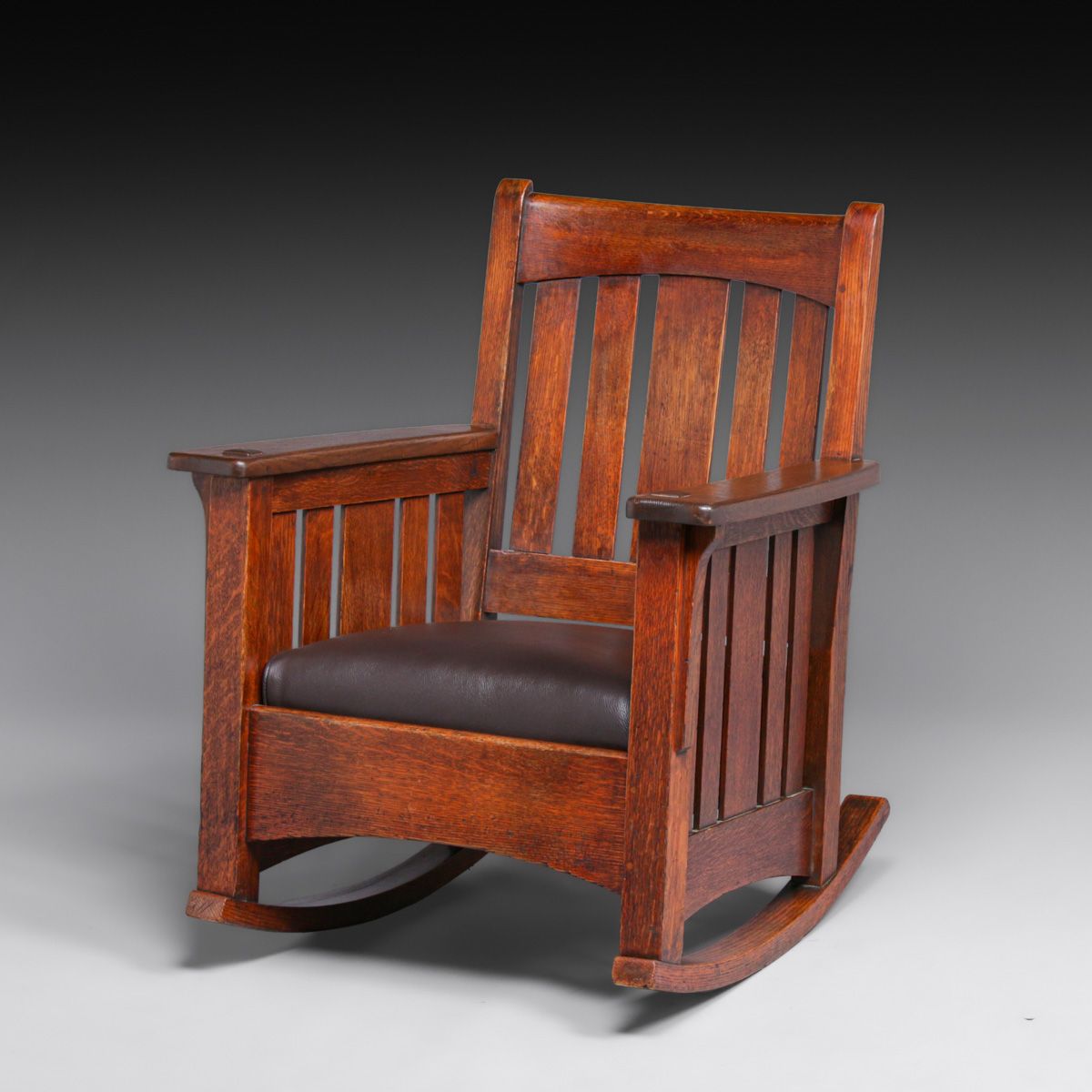 Limbert Oak Slatted Rocker c1910. Signed with branded mark. Excellent original finish. 35″h x 29.5″w x 31″d