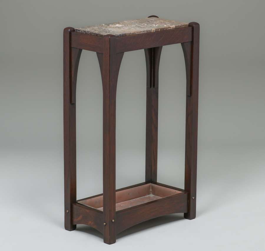 Limbert Oak Umbrella Stand Side Table c1910. Originally an umbrella stand, someone added a piece of marble to make a nice side table. Signed. Very nicely refinished. 28"h x 17"w x 9"d SOLD