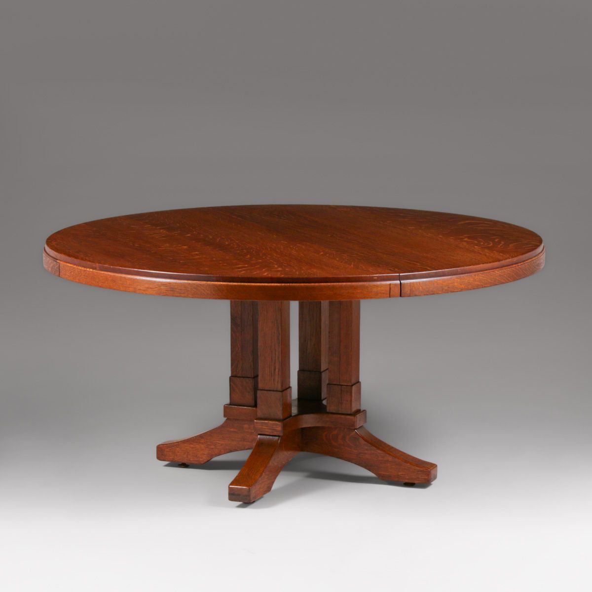 Limbert Prairie School 60"d Pedestal Dining Table c1910. Unsigned. Four 12"w new skirted leaves. Top refinished perfectly to match excellent original finish. 60"d x 29.75"h (expands to 108" x 60").